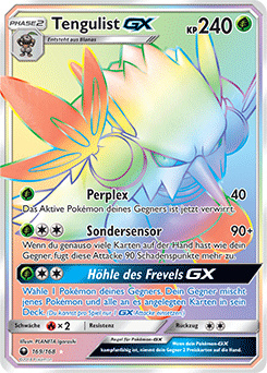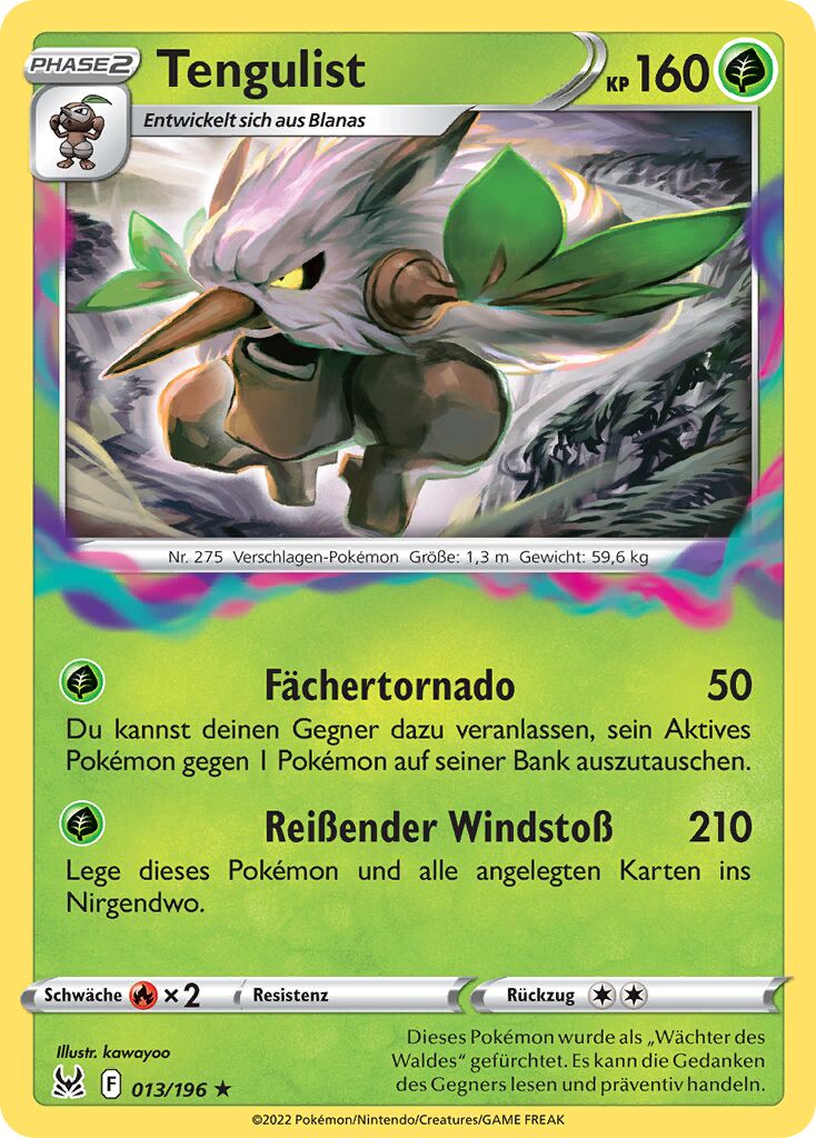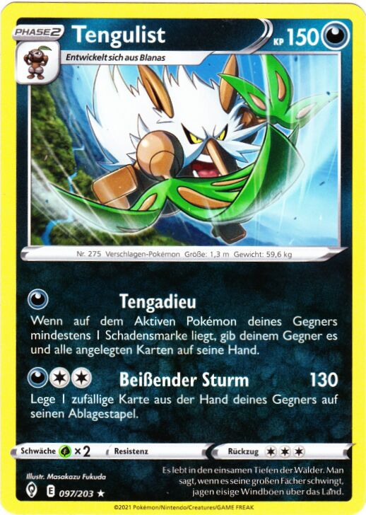 - OR Tengulist ist ein geheimnisvolles Pokémon, das angeblich auf hohen Bäumen lebt, die Tausende von Jahren alt sind. Mit den Blätterfächern an seinen Händen kann es heftige Stürme erzeugen.