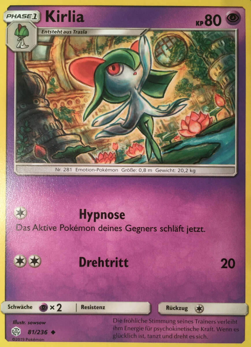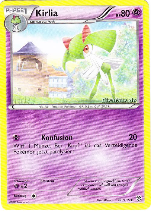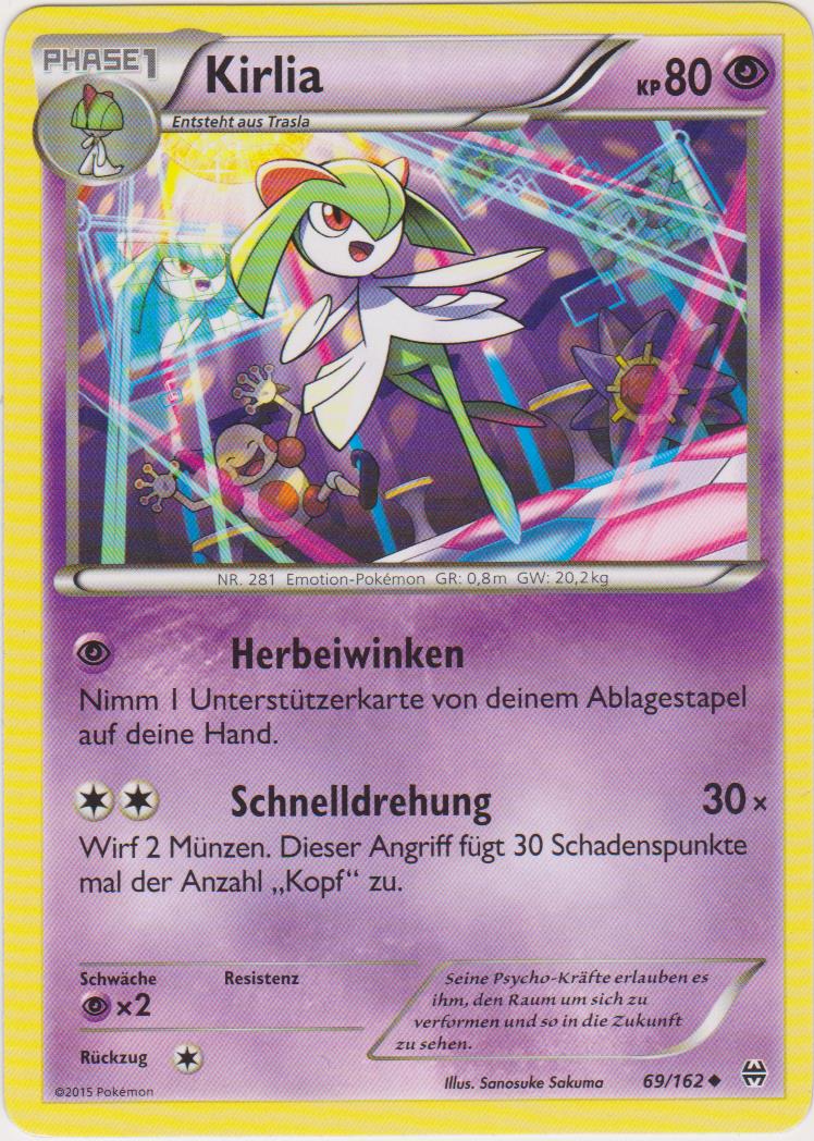 - R Man sagt, dass ein KIRLIA, das häufig positive Emotionen seines TRAINERs wahrnimmt, sehr schön wird. Dieses POKéMON kontrolliert psychokinetische Energie mit seinem hochentwickelten Gehirn.