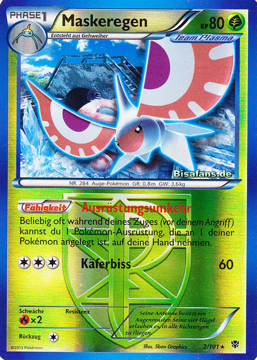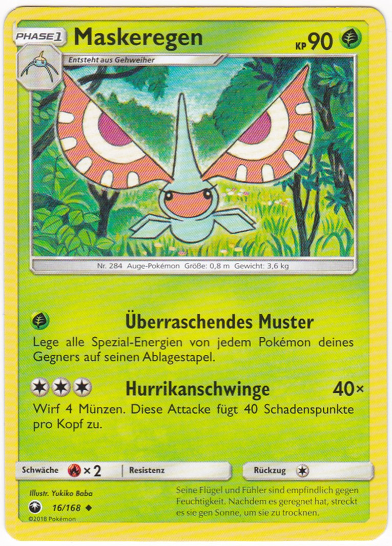 - OR Maskeregen schüchtert seine Feinde mit den augenähnlichen Mustern auf seinen Antennen ein. Dieses Pokémon kann mit seinen vier Flügeln wie ein Hubschrauber in jede Richtung fliegen, sogar seitwärts und rückwärts.