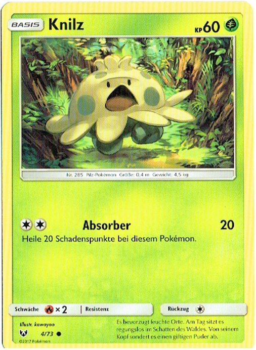 - OR Knilz lebt im feuchten Erdboden finsterer Wälder. Es wird oft reglos unter herabgefallenen Blättern gefunden. Dieses Pokémon ernährt sich von Kompost aus verrotteten Blättern.