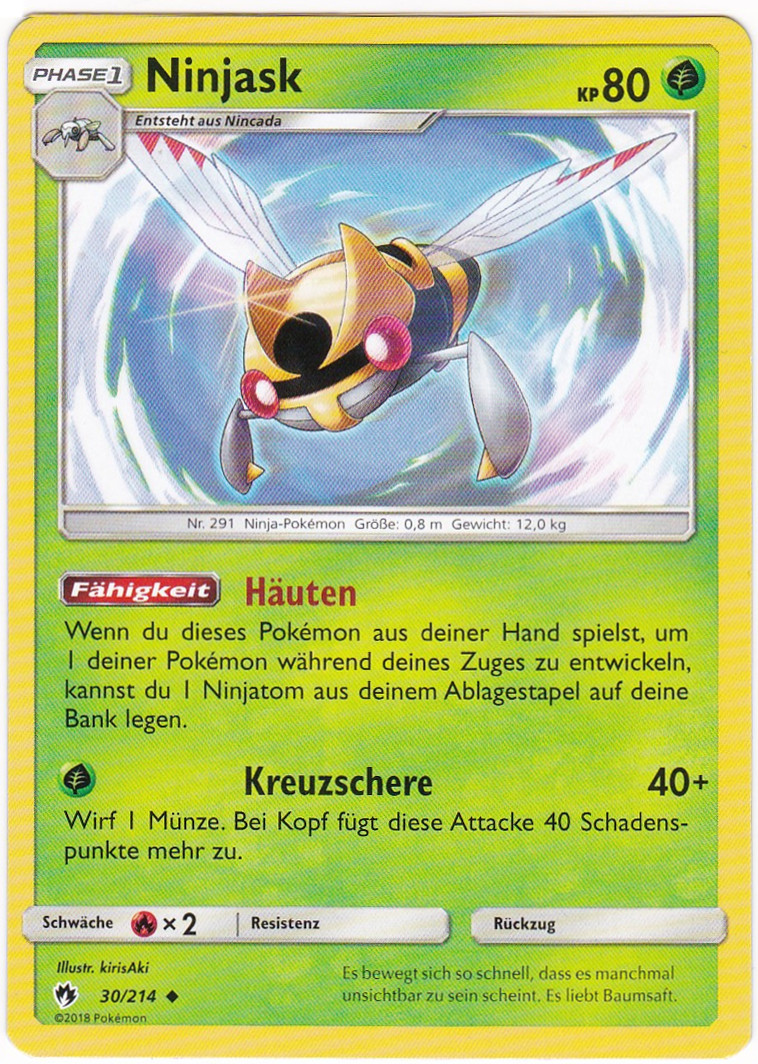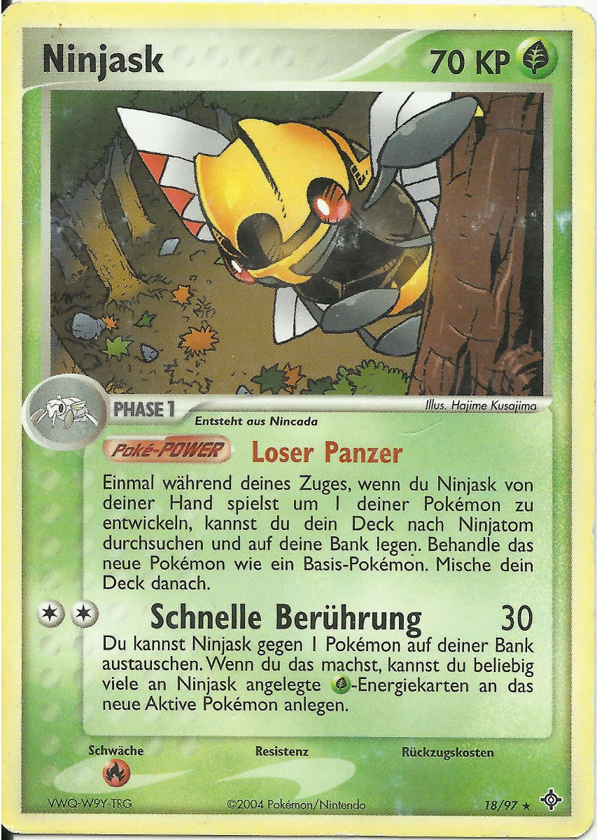 - OR Ninjask bewegt sich so schnell, dass man es nicht sehen kann. Seine Schreie sind aber laut und deutlich zu hören. Deshalb hielt man dieses Pokémon lange für unsichtbar.