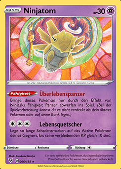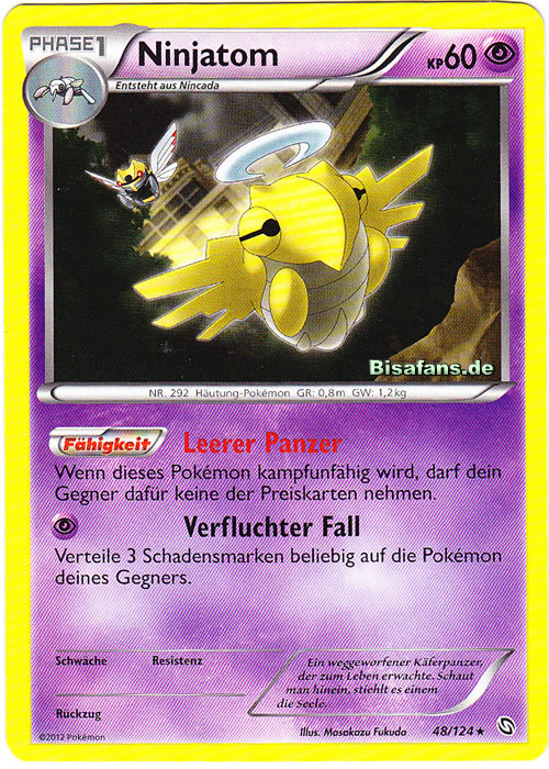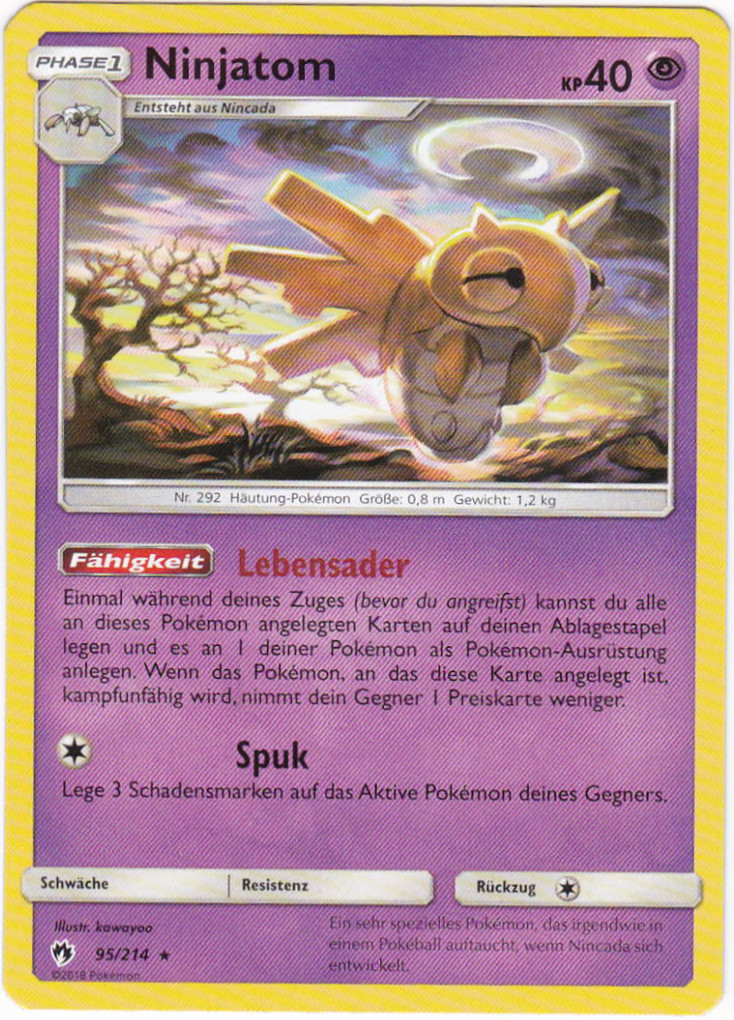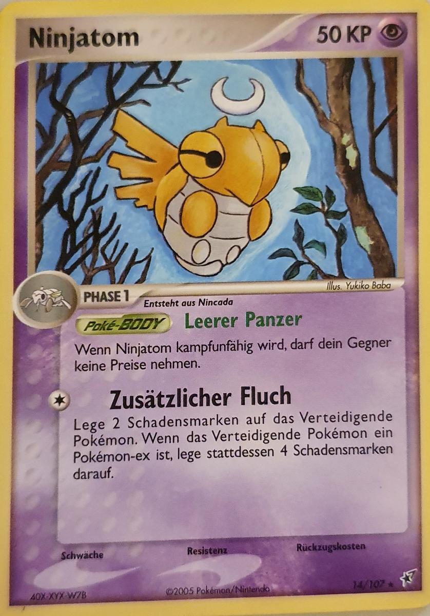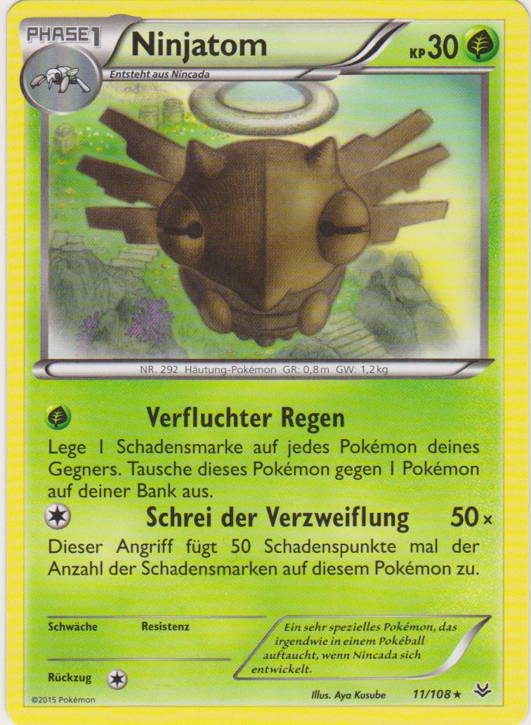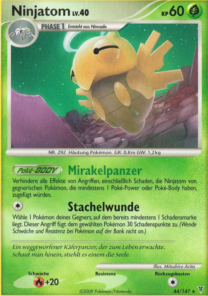 - OR Ninjatoms harter Körper bewegt sich überhaupt nicht. Er scheint bloß eine hohle Schale zu sein. Dieses Pokémon soll angeblich die Seele eines jeden stehlen, der hinterrücks einen Blick in seinen hohlen Körper riskiert.