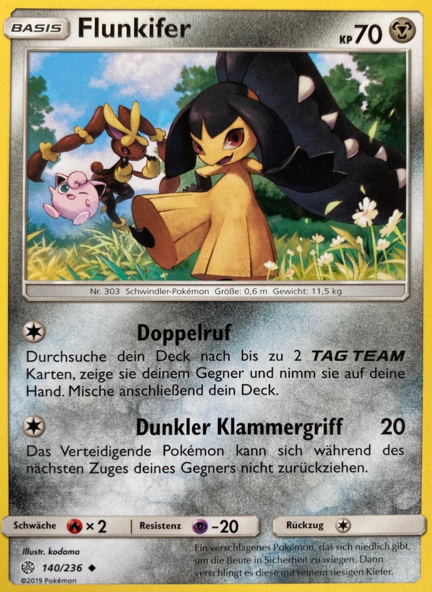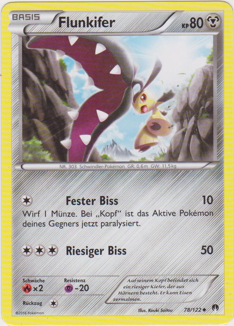 - AS Fall bloß nicht auf das hübsche Gesicht dieses Pokémon herein – es ist sehr gefährlich. Flunkifer lenkt seine Feinde ab und schlägt dann mit seinem massiven Kiefer zu. Sein kräftiger Stahlkiefer besteht aus umgewandelten Hörnern.