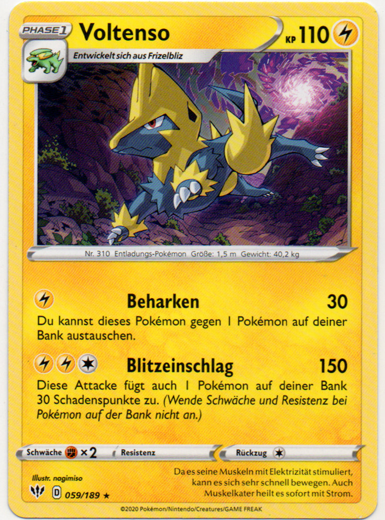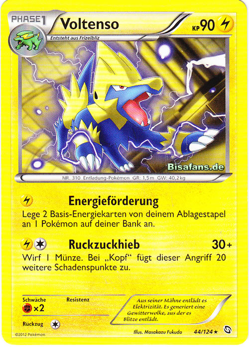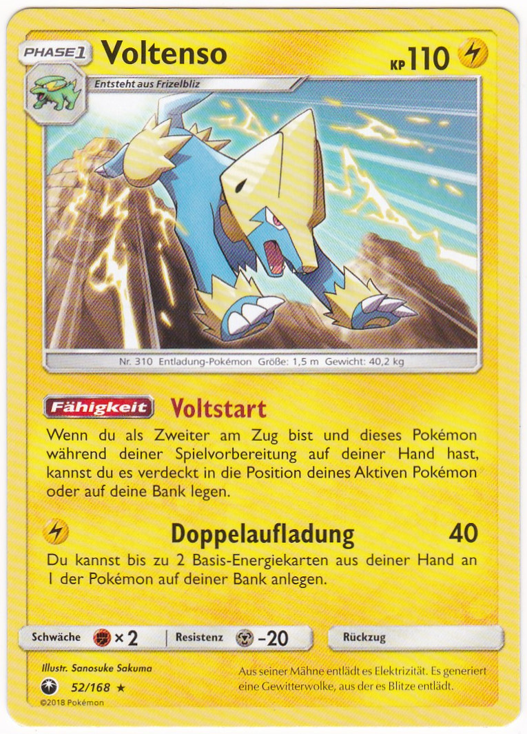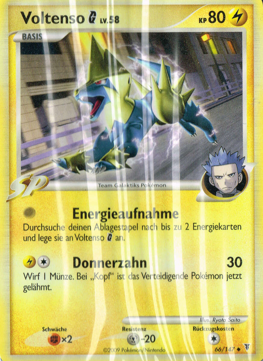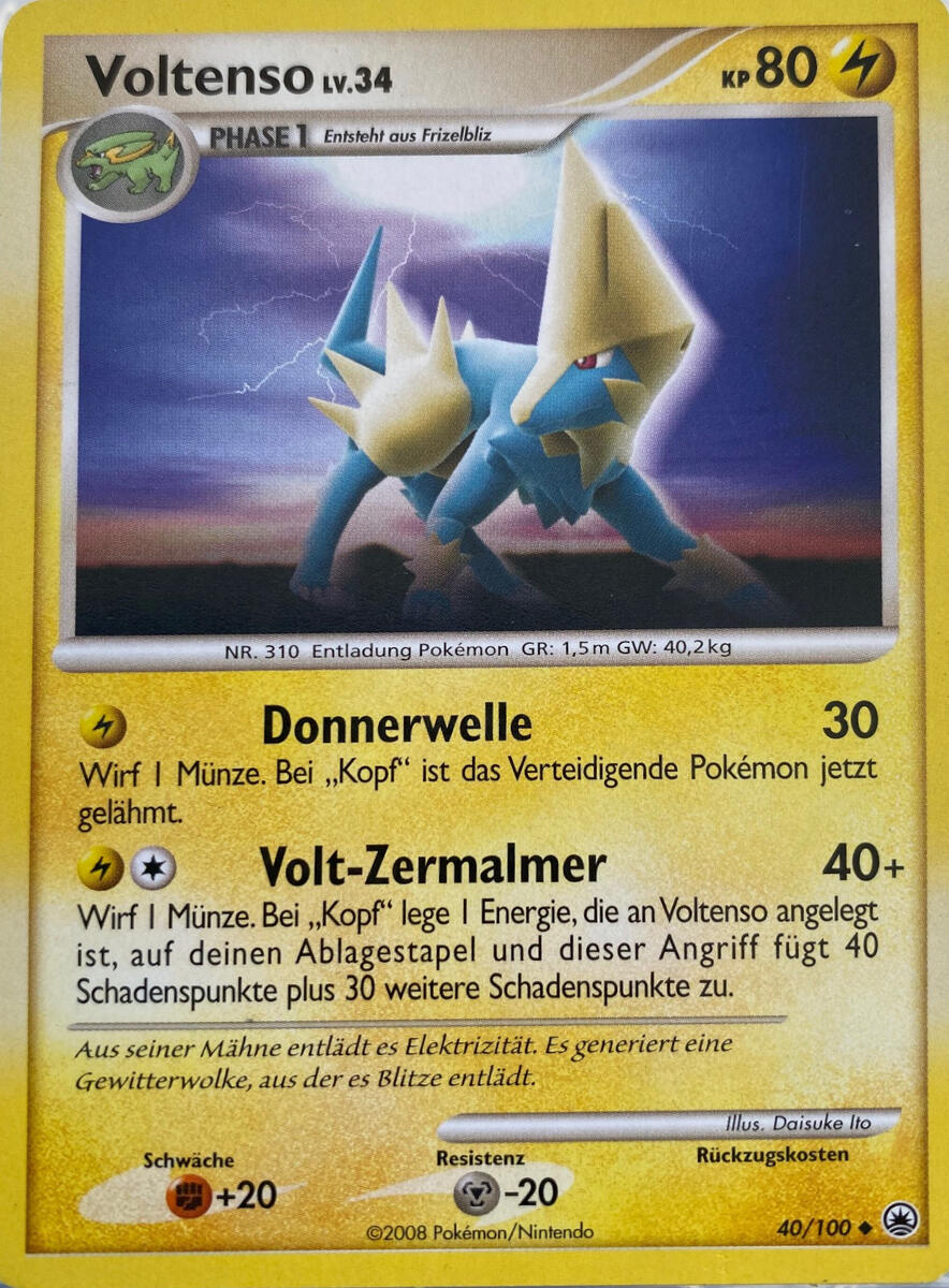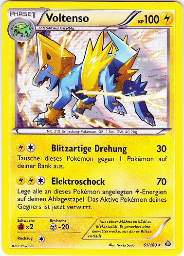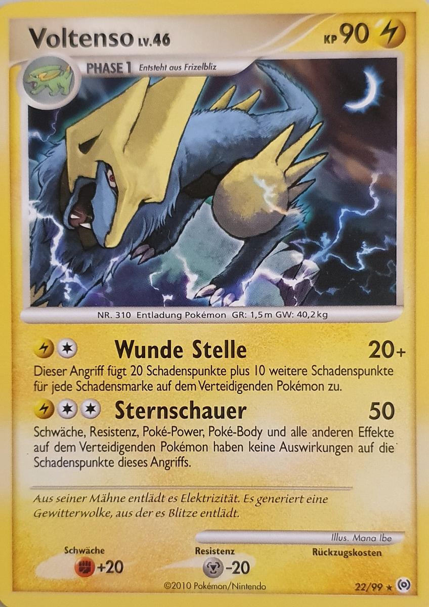 - OR Voltenso entlädt ständig Elektrizität aus seiner Mähne. Es fliegen dabei Funken, die zuweilen zu Waldbränden führen. In einem Kampf erzeugt dieses Pokémon Gewitterwolken.