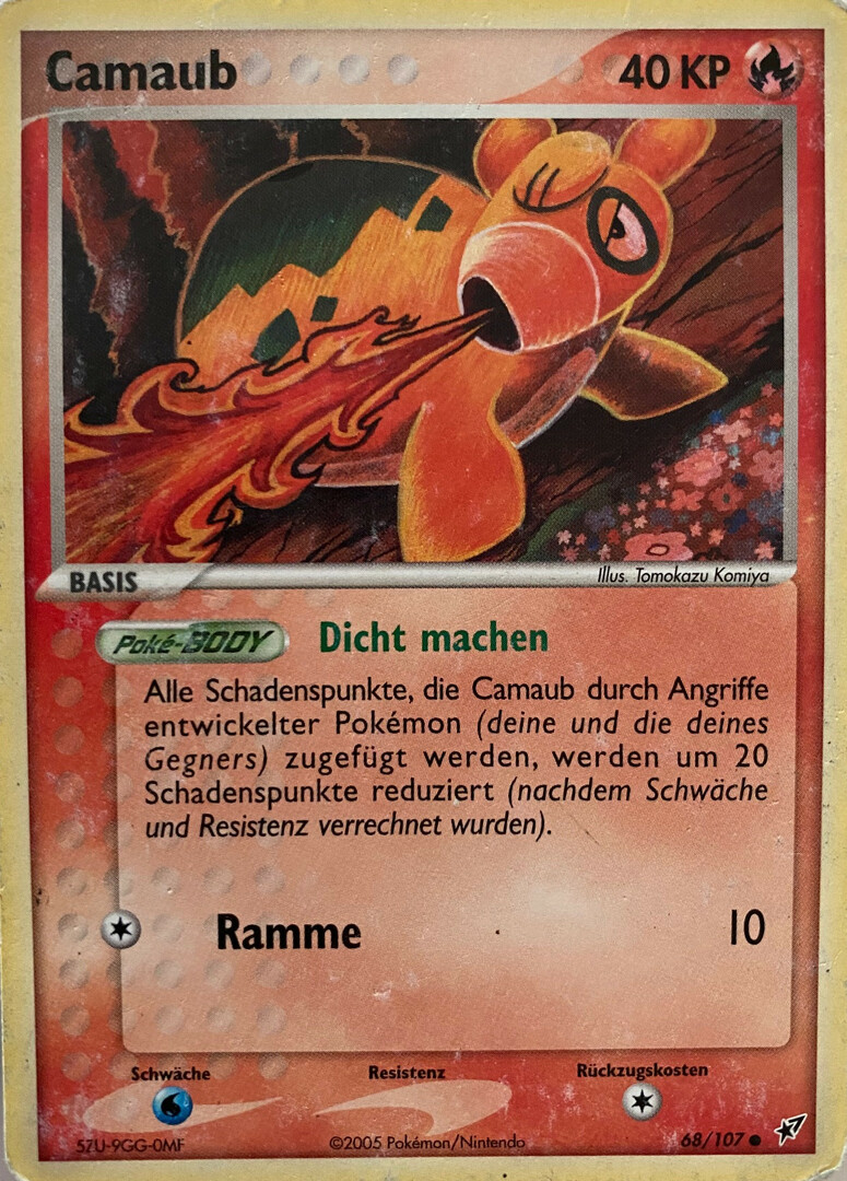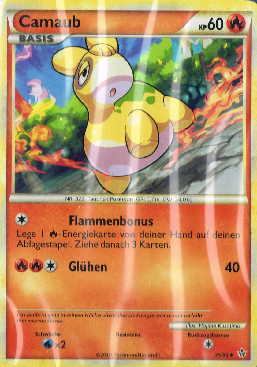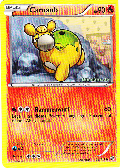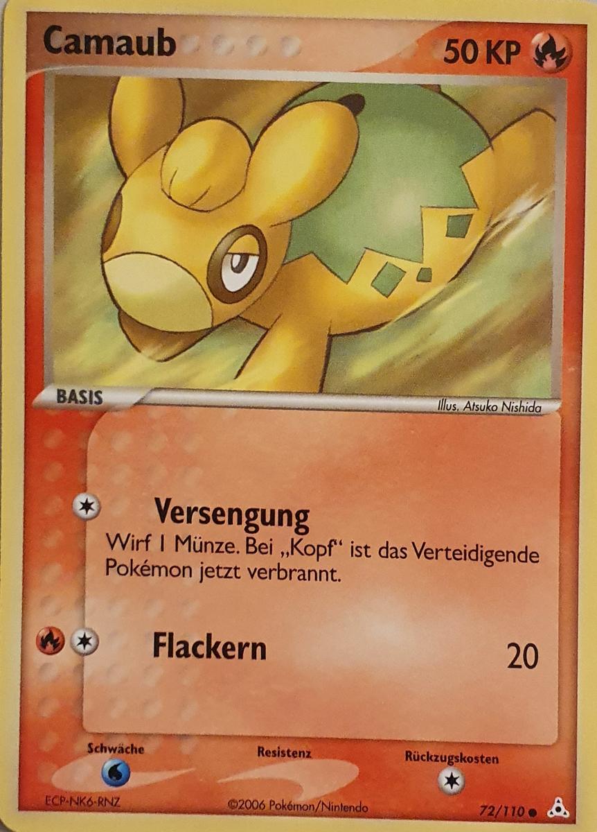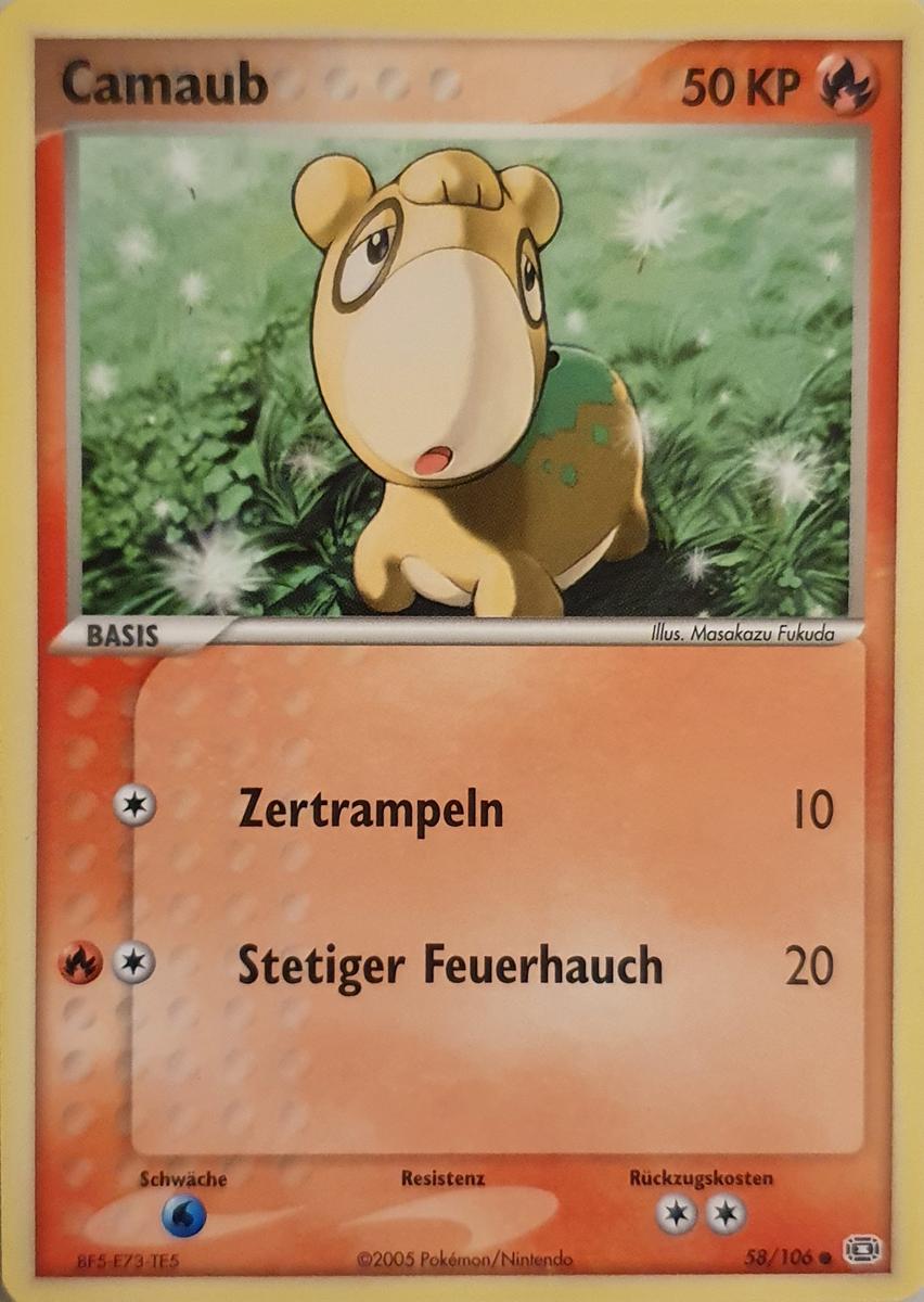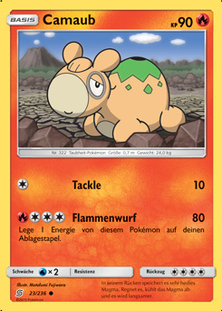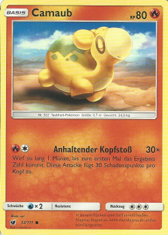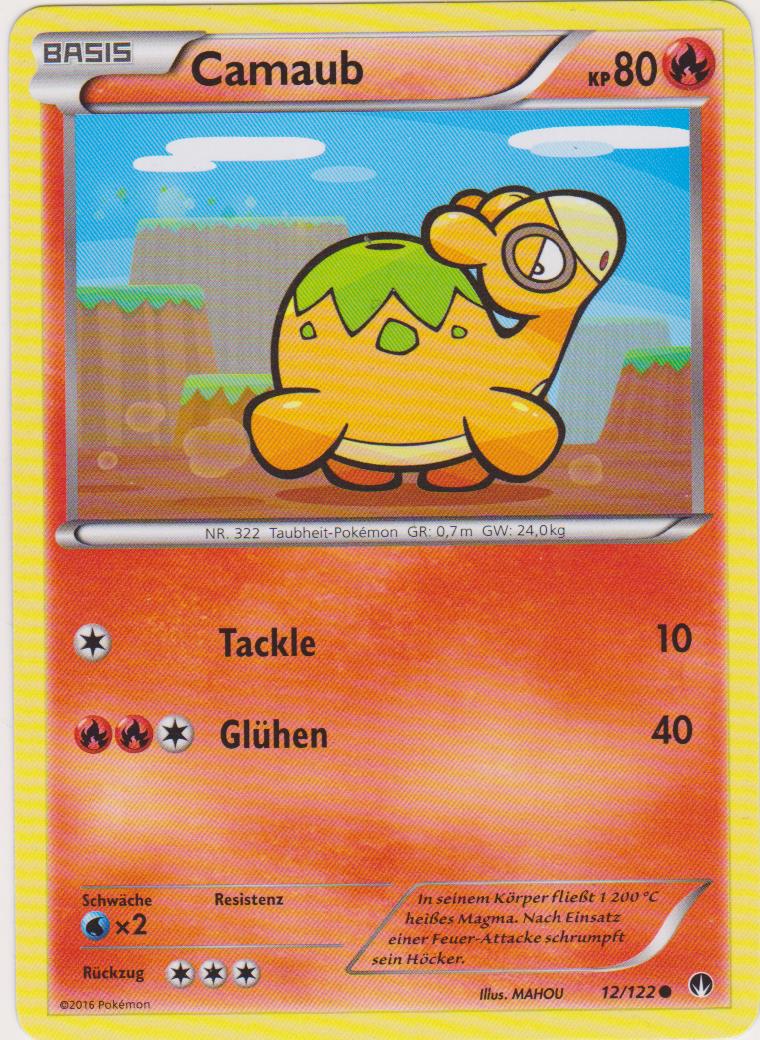 - AS Camaub speichert fast 1 200 °C heißes Magma in seinem Körper. Wenn es nass wird, kühlt das Magma ab und wird hart. Dadurch wird der Körper dieses Pokémon schwer und seine Bewegungen träge.