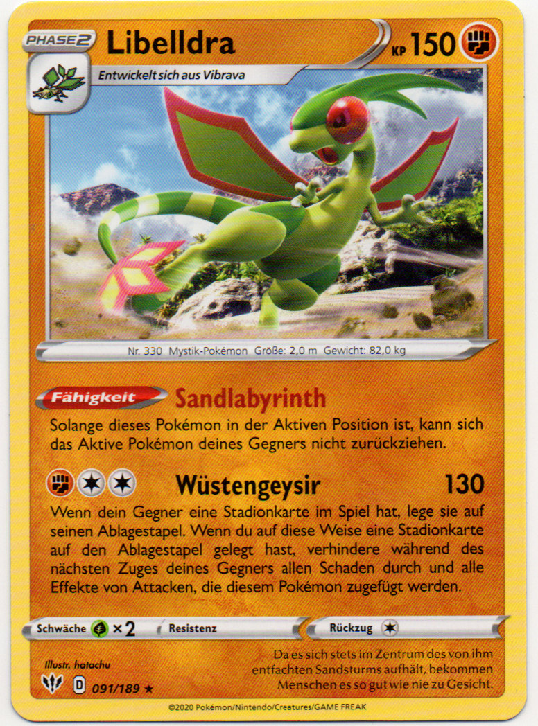 - OR Libelldra wird auch „Geist der Wüste“ genannt. Da seine flatternden Flügel eine Sandwolke aufwirbeln, ist dieses Pokémon beim Fliegen immer von einem Sandsturm umgeben.