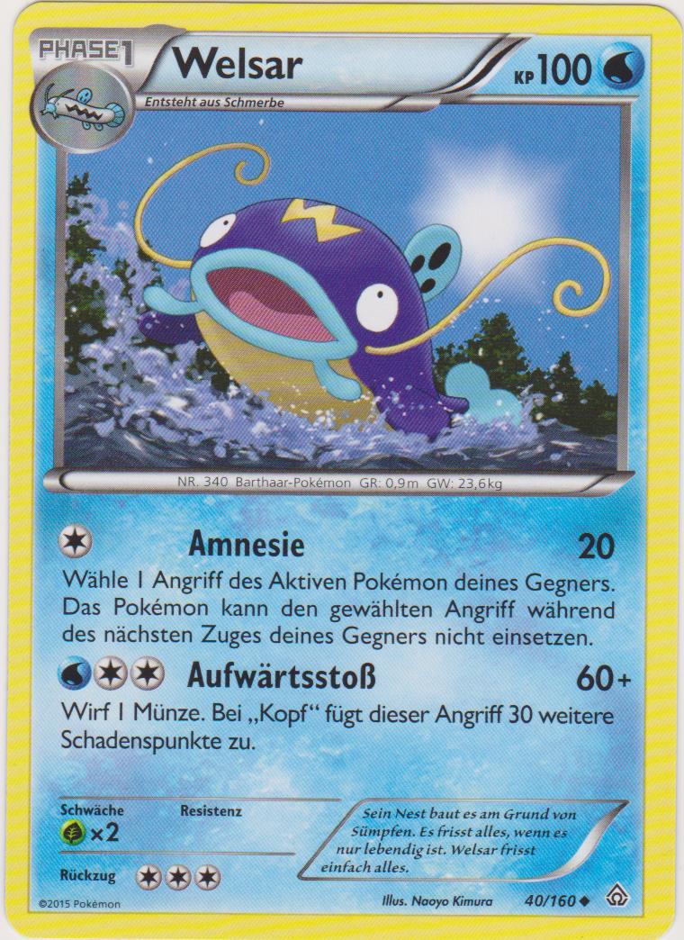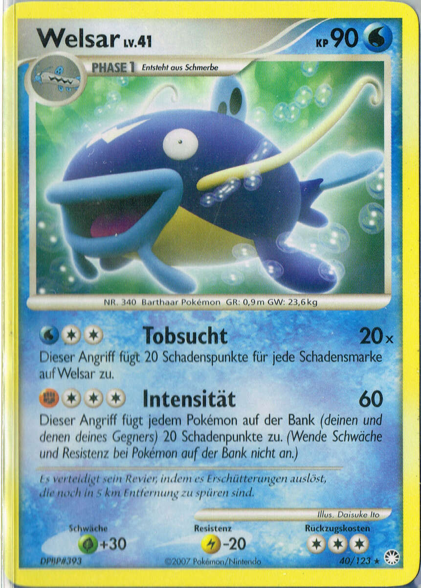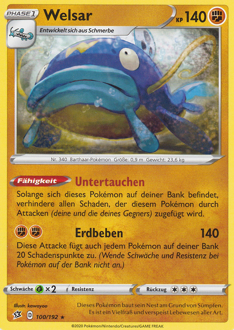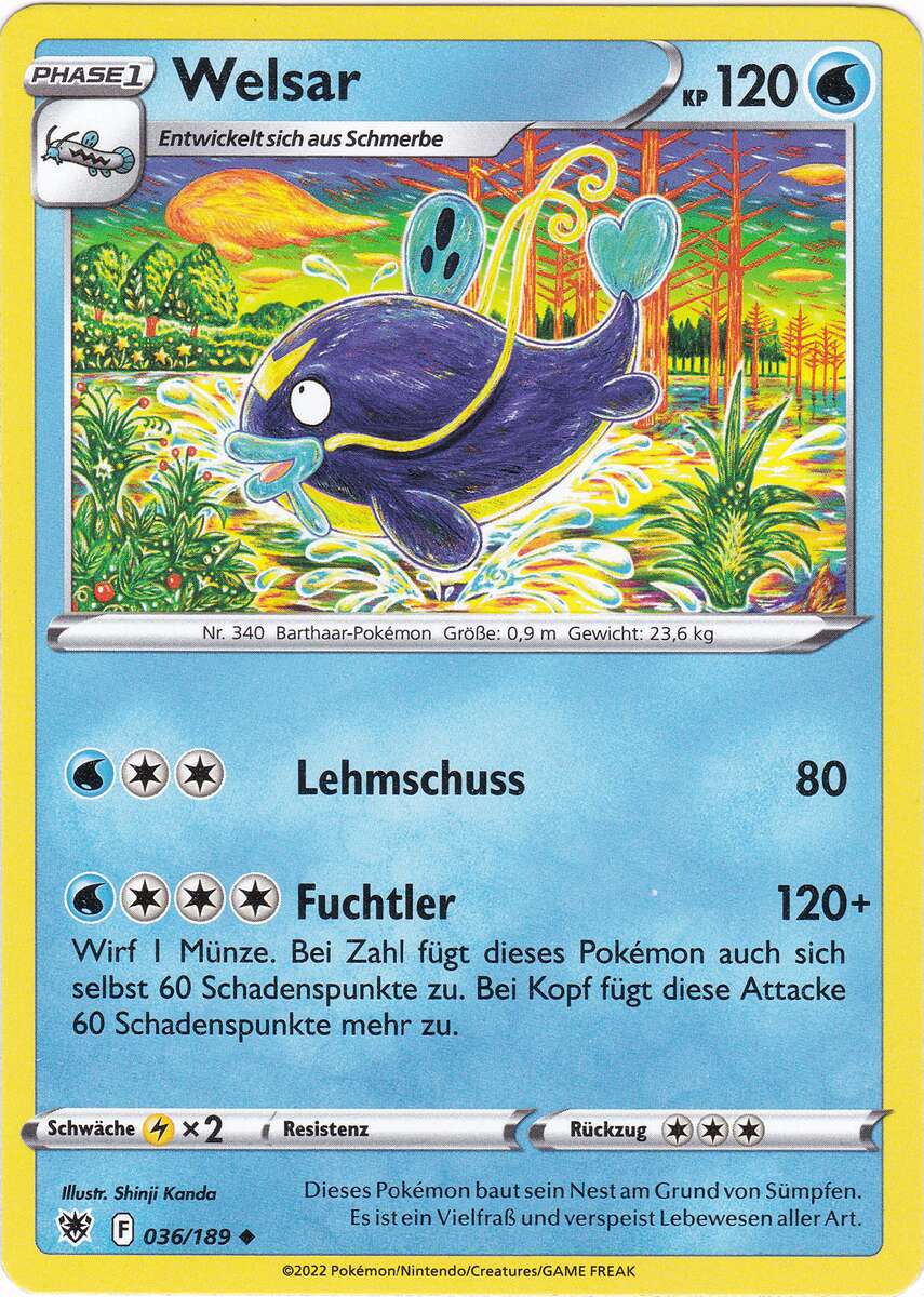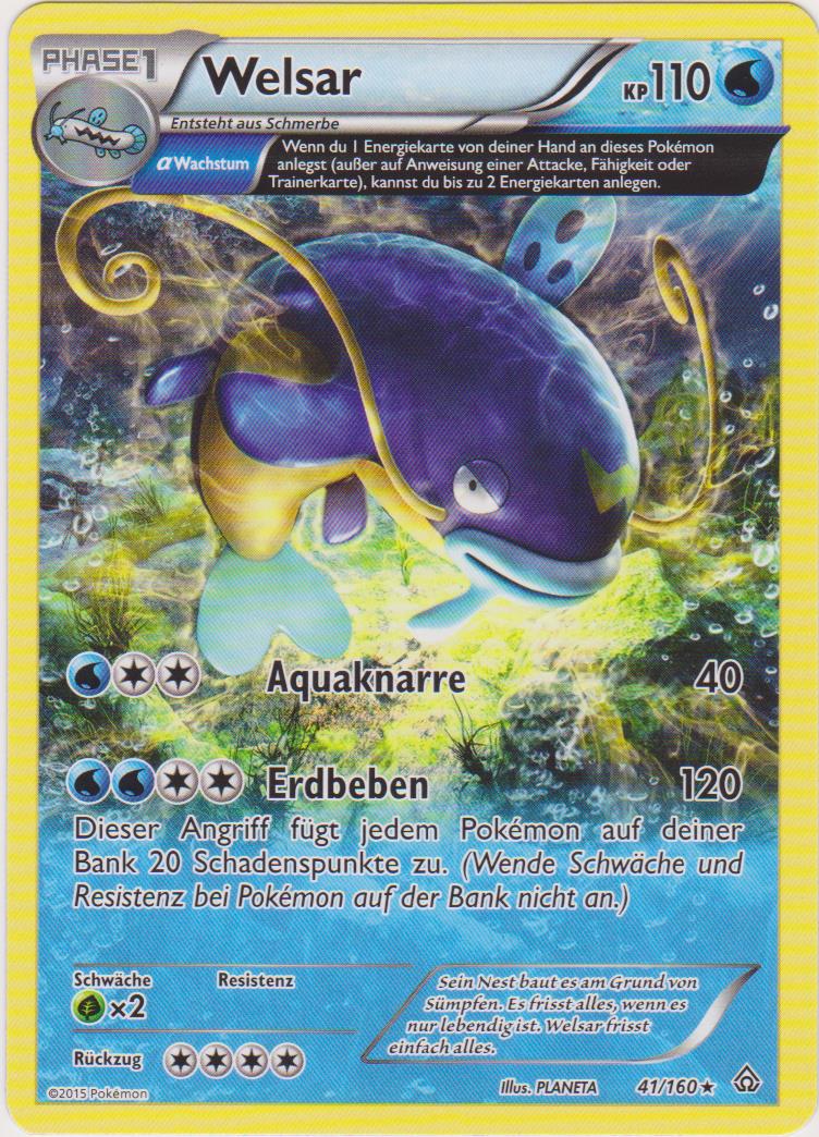 - OR Welsar legt viel Wert auf sein Territorium. Ein einzelnes Pokémon dieser Art nennt einen Teich sein Eigen. Wenn sich ein Feind nähert, schlägt es um sich und verursacht ein gewaltiges Erdbeben.