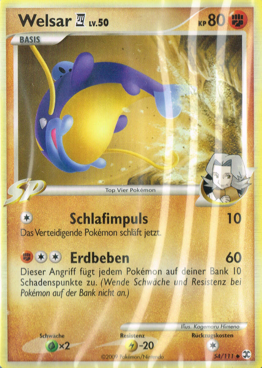 - AS Wenn Welsar auf einen wilden Beutezug geht, erzeugt es ein Beben mit einem Radius von 5 km. Dieses Pokémon kann wirkliche Erdbeben voraussehen.