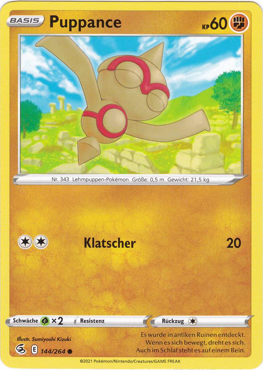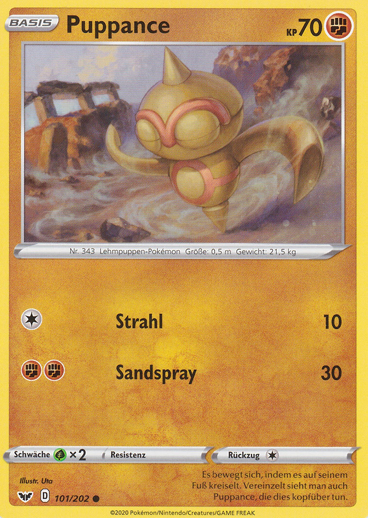 - S Sobald es Artgenossen bemerkt, tut sich PUPPANCE mit ihnen zusammen und sie brüllen gemeinsam. Dieses POKéMON schläft, während es geschickt auf seinem Fuß balanciert.