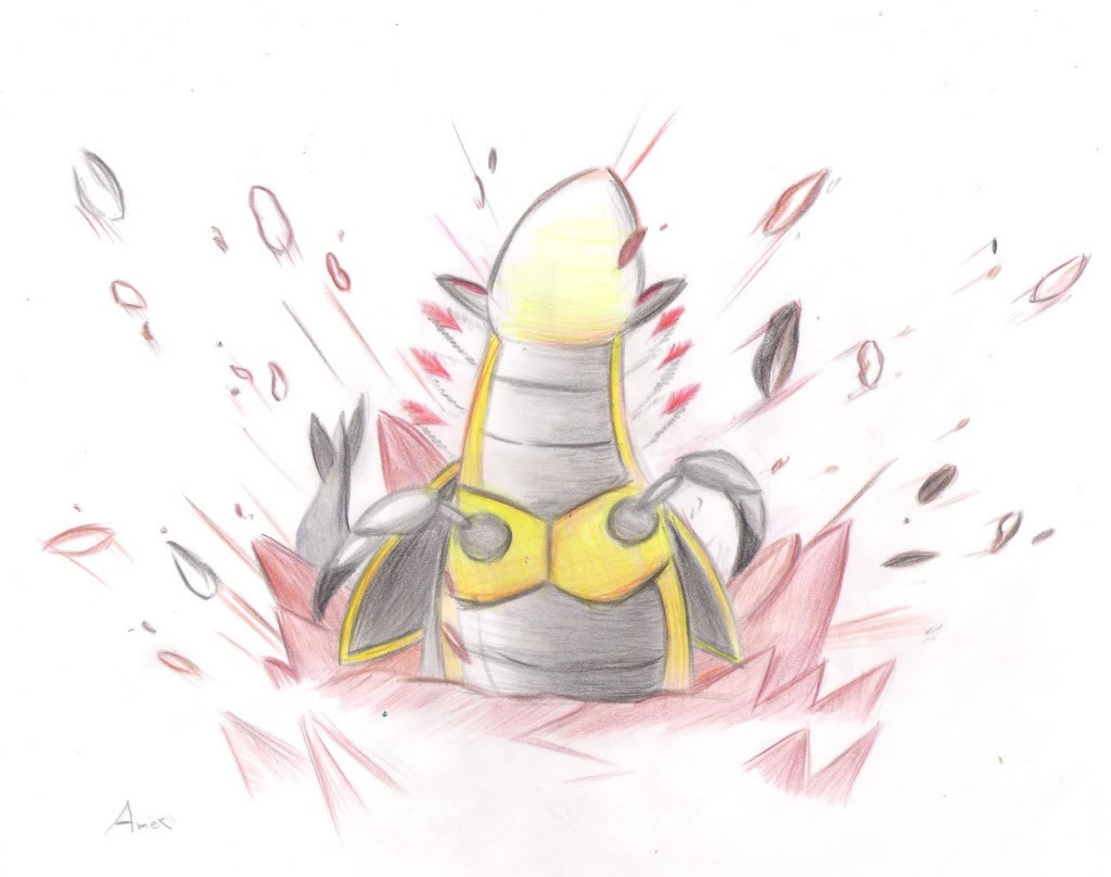 - R Von ARMALDOs hartem Panzer prallen alle Angriffe ab. Dieses POKéMON hat zwei mächtige Klauen, die es ausfahren oder einziehen kann. Es hat so viel Kraft, dass es damit eine Stahlplatte pulverisieren kann.
