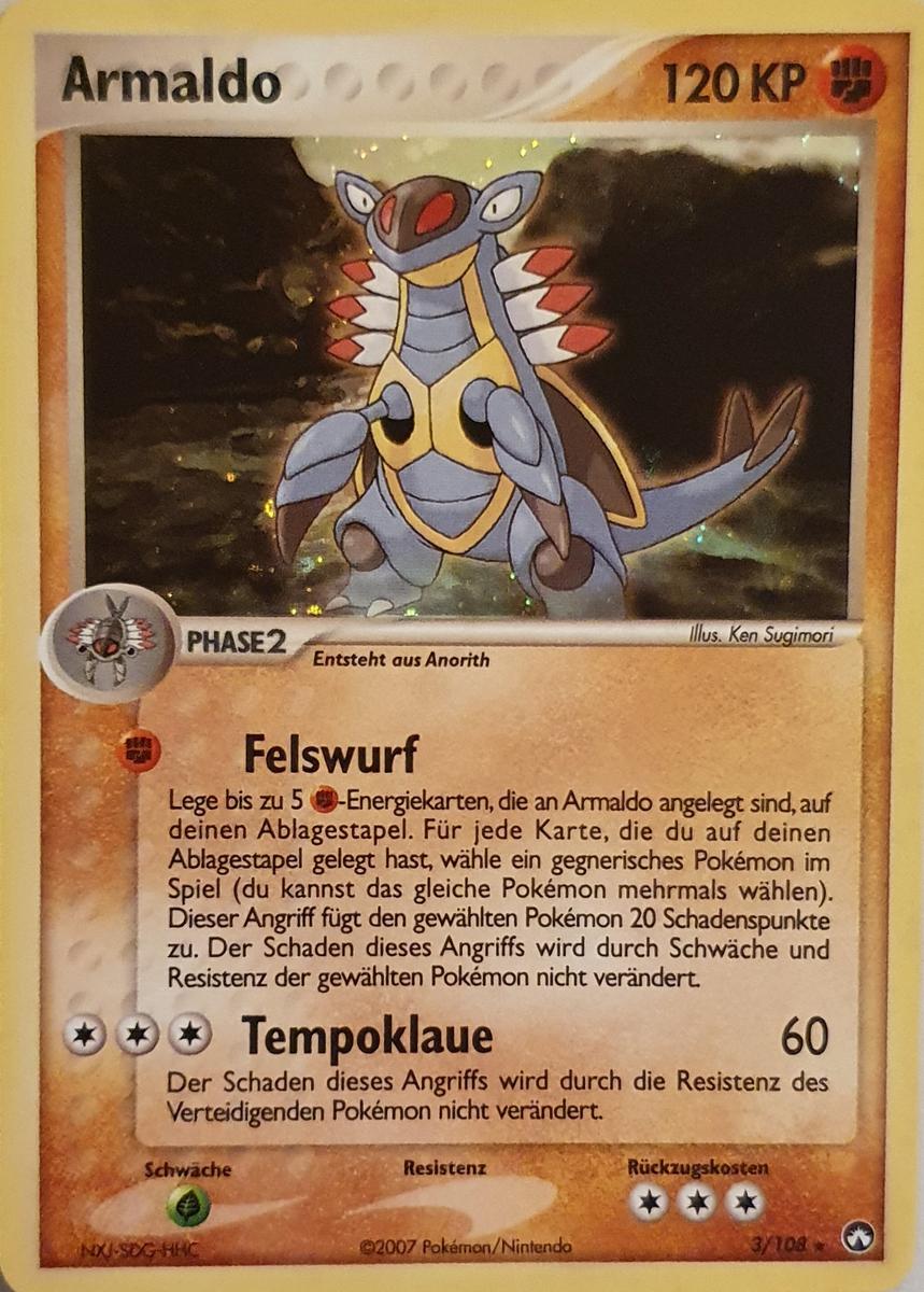 - GO Von Armaldos hartem Panzer prallen alle Angriffe ab. Dieses Pokémon hat zwei mächtige Klauen, die es ausfahren und einziehen kann. Es hat so viel Kraft, dass es damit eine Stahlplatte pulverisieren kann.