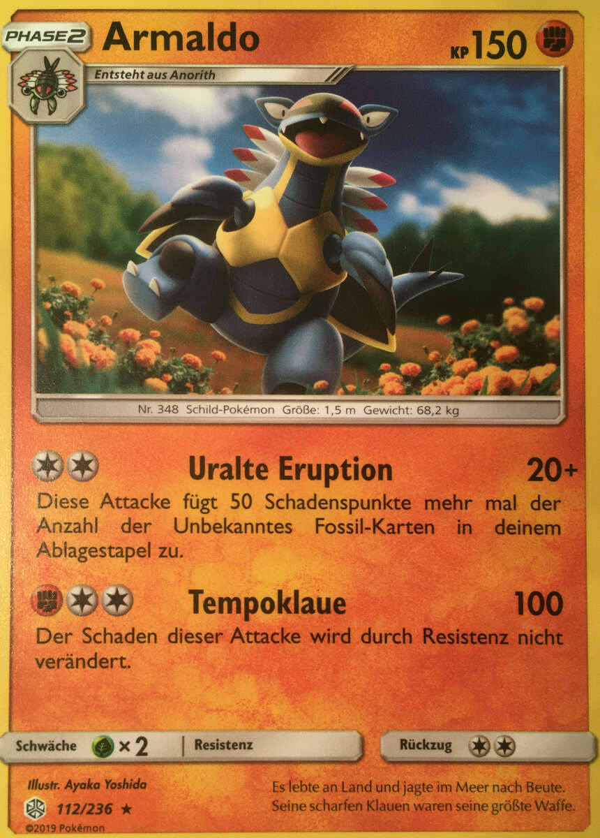 - OR Von Armaldos hartem Panzer prallen alle Angriffe ab. Dieses Pokémon hat zwei mächtige Klauen, die es ausfahren oder einziehen kann. Es hat so viel Kraft, dass es damit eine Stahlplatte pulverisieren kann.