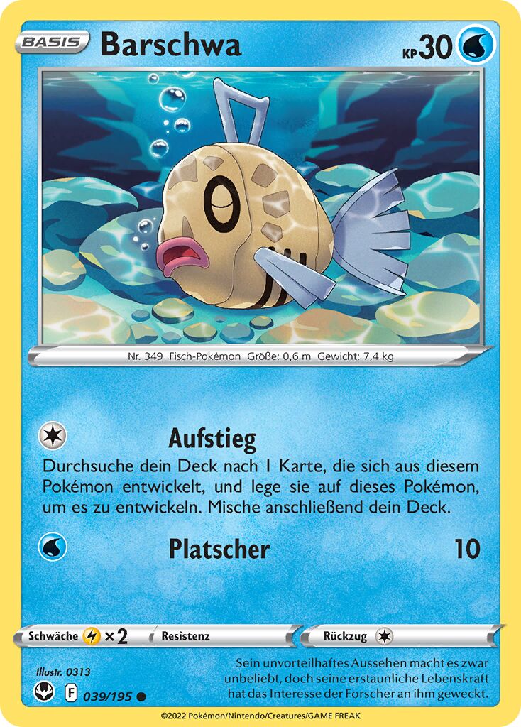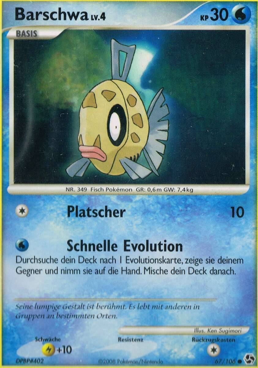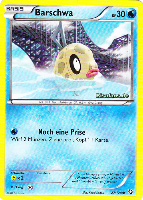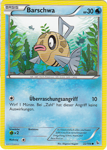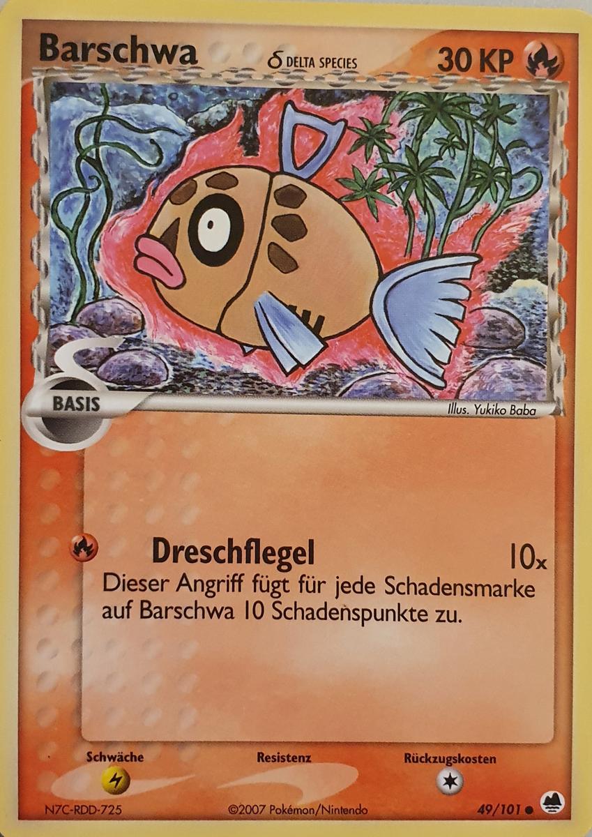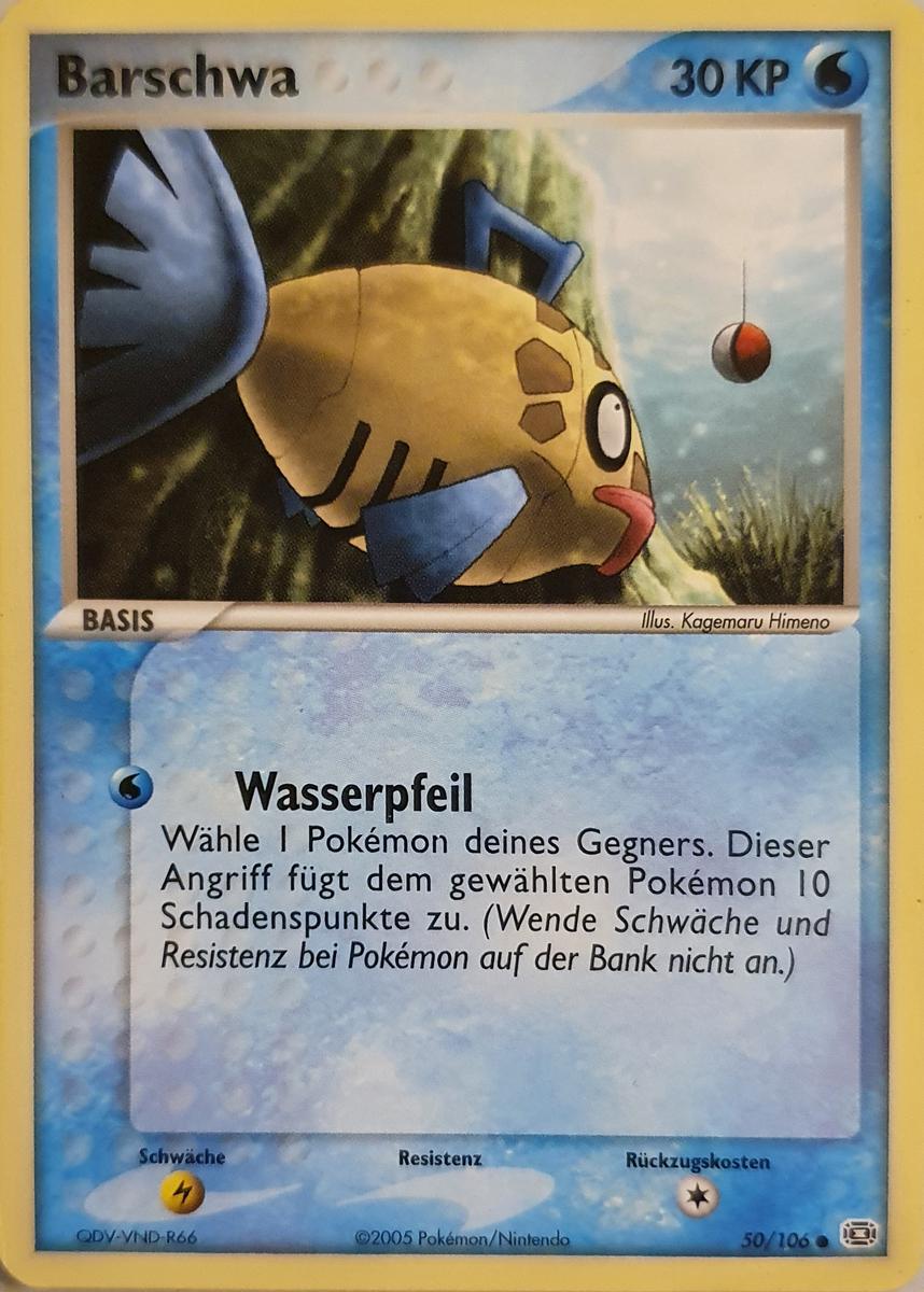 - OR Barschwas Flossen waren schon immer zerfetzt. Wegen seines merkwürdigen Aussehens wird dieses Pokémon weitgehend ignoriert. Es kann sowohl im Meer als auch in Flüssen leben.