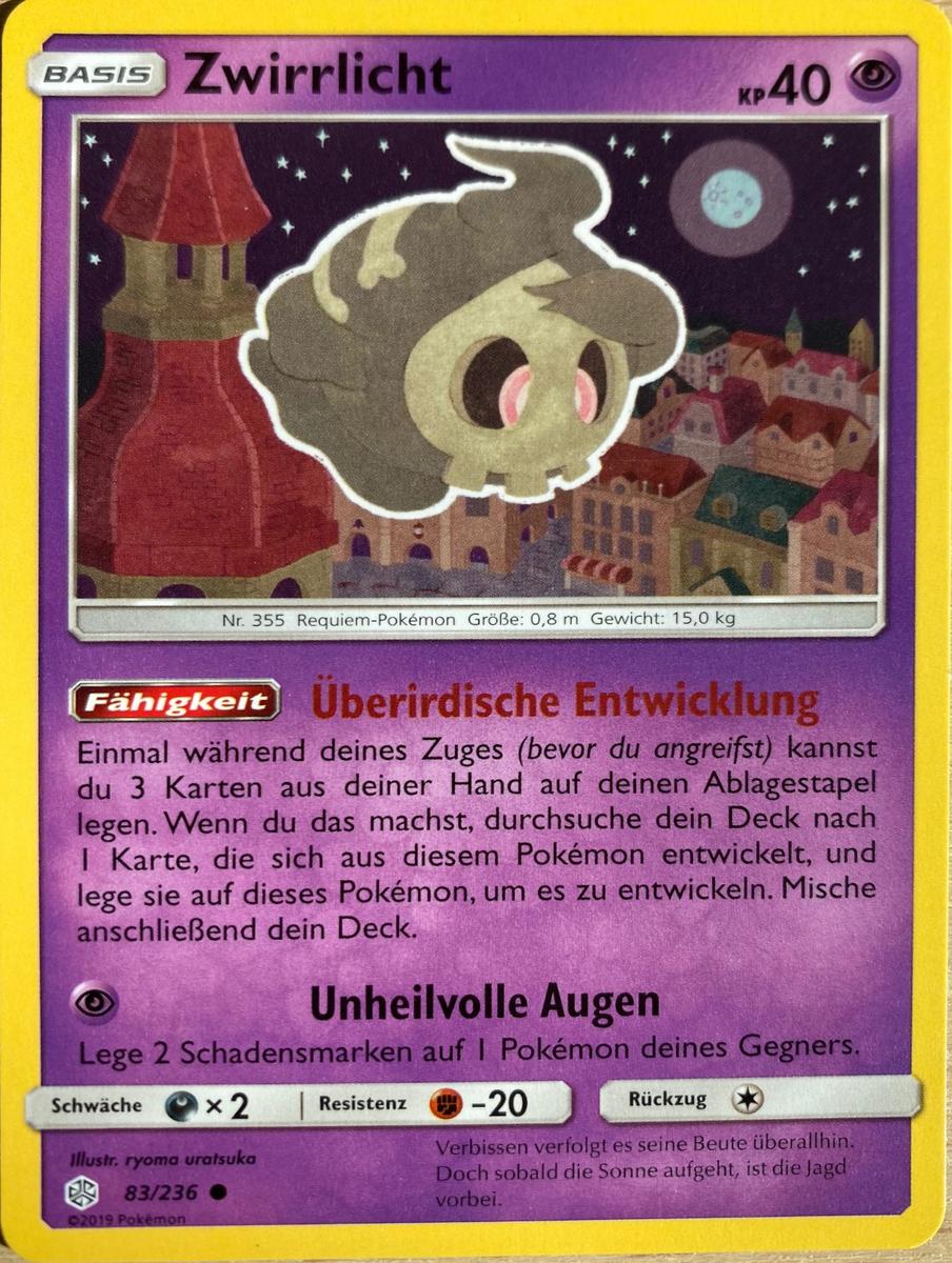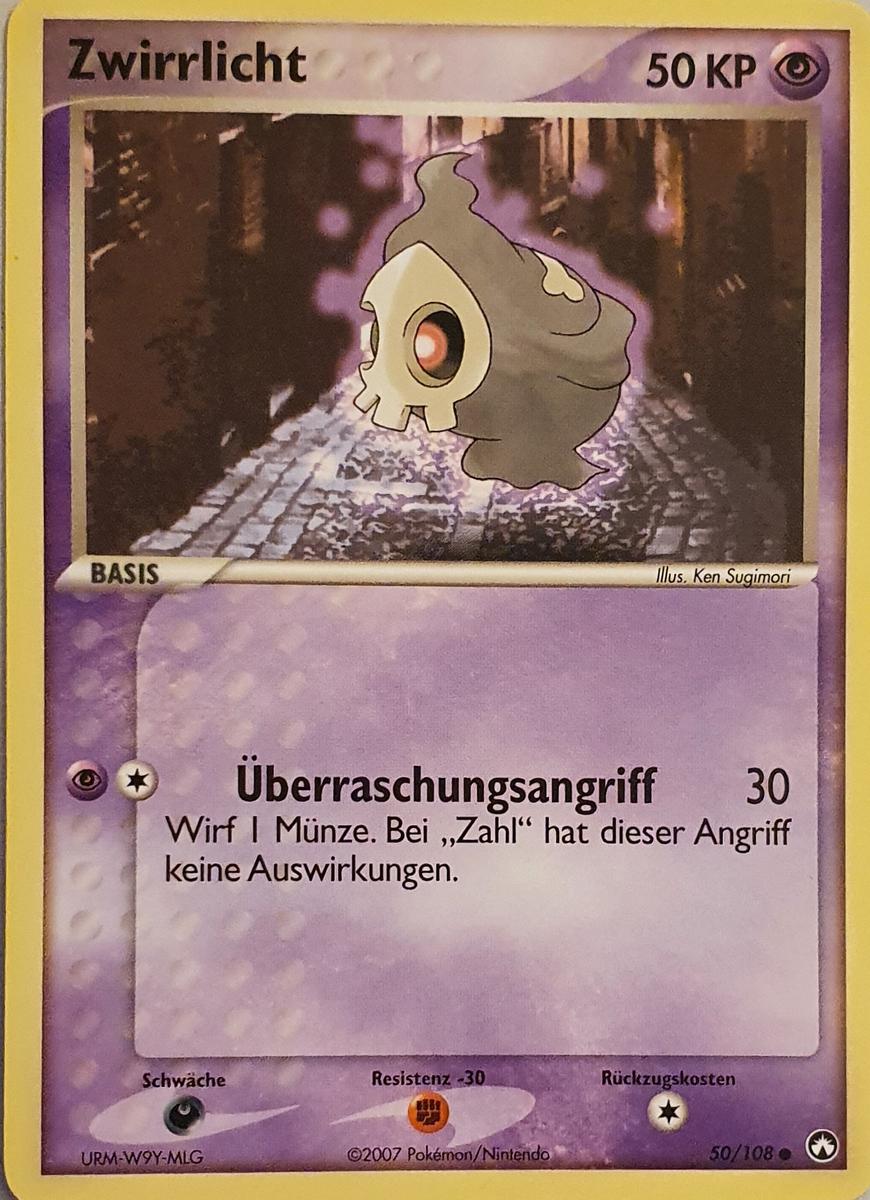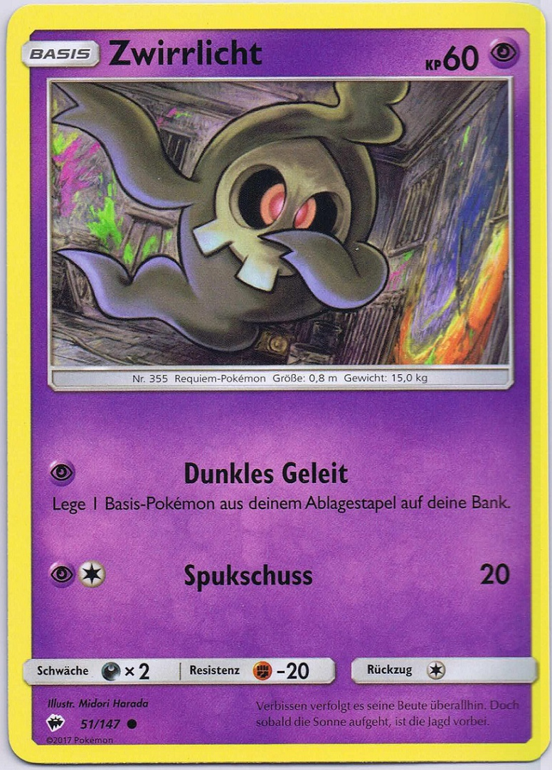 - OR Zwirrlicht kann durch jede Wand gehen, egal, wie dick diese ist. Wenn dieses Pokémon sich ein Ziel gesucht hat, verfolgt es seinen Feind unnachgiebig bis zum Sonnenaufgang.