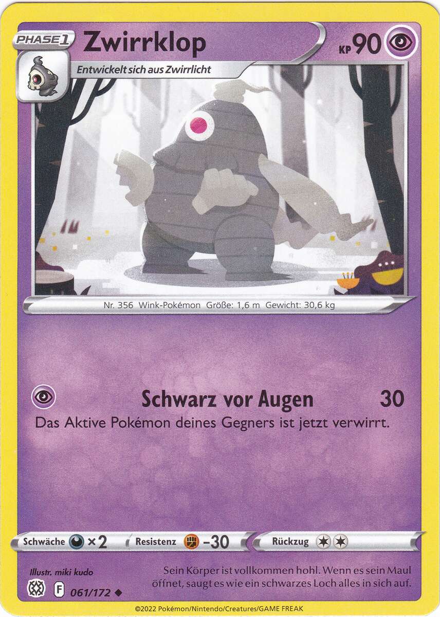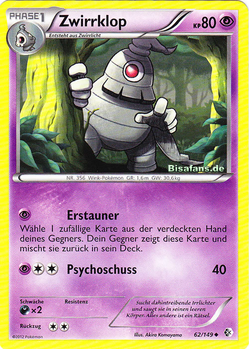 - AS Zwirrklop absorbiert alles, egal, wie groß es auch sein mag. Dieses Pokémon hypnotisiert seinen Gegner, indem es auf makabre Weise winkt und sein einziges Auge zeigt. Der hypnotisierte Gegner führt dann seine Befehle aus.