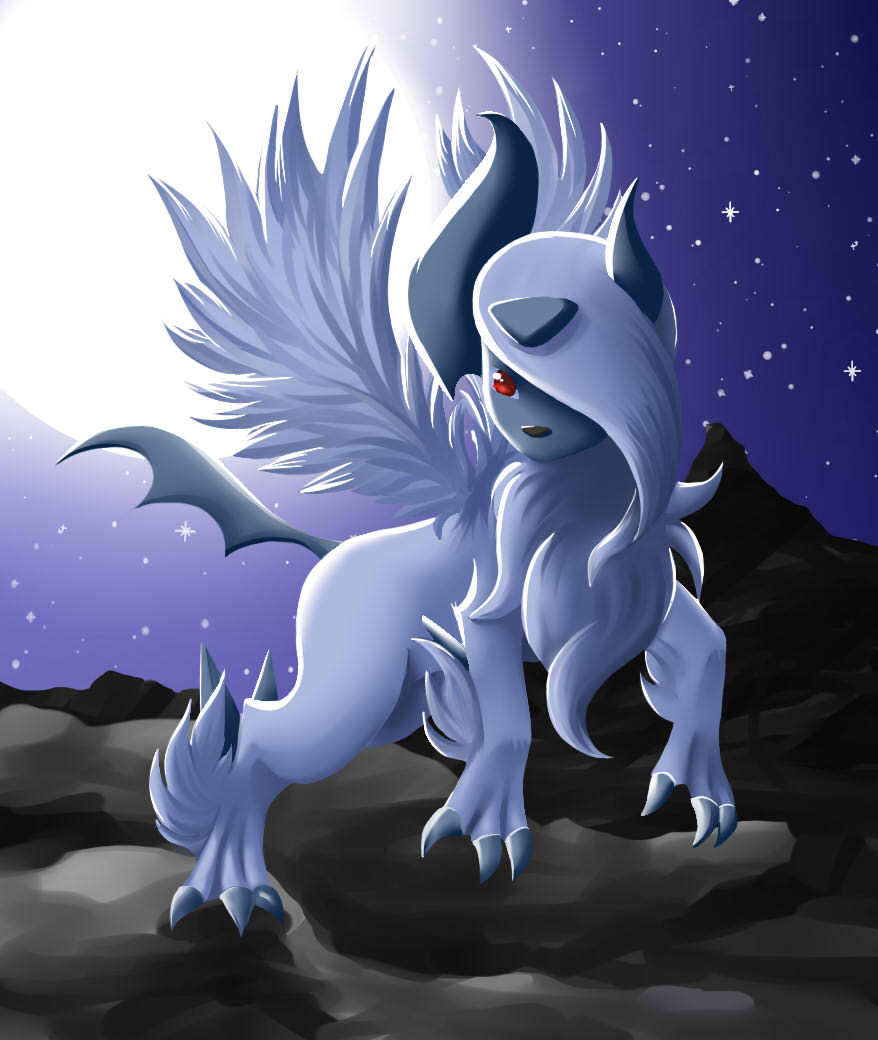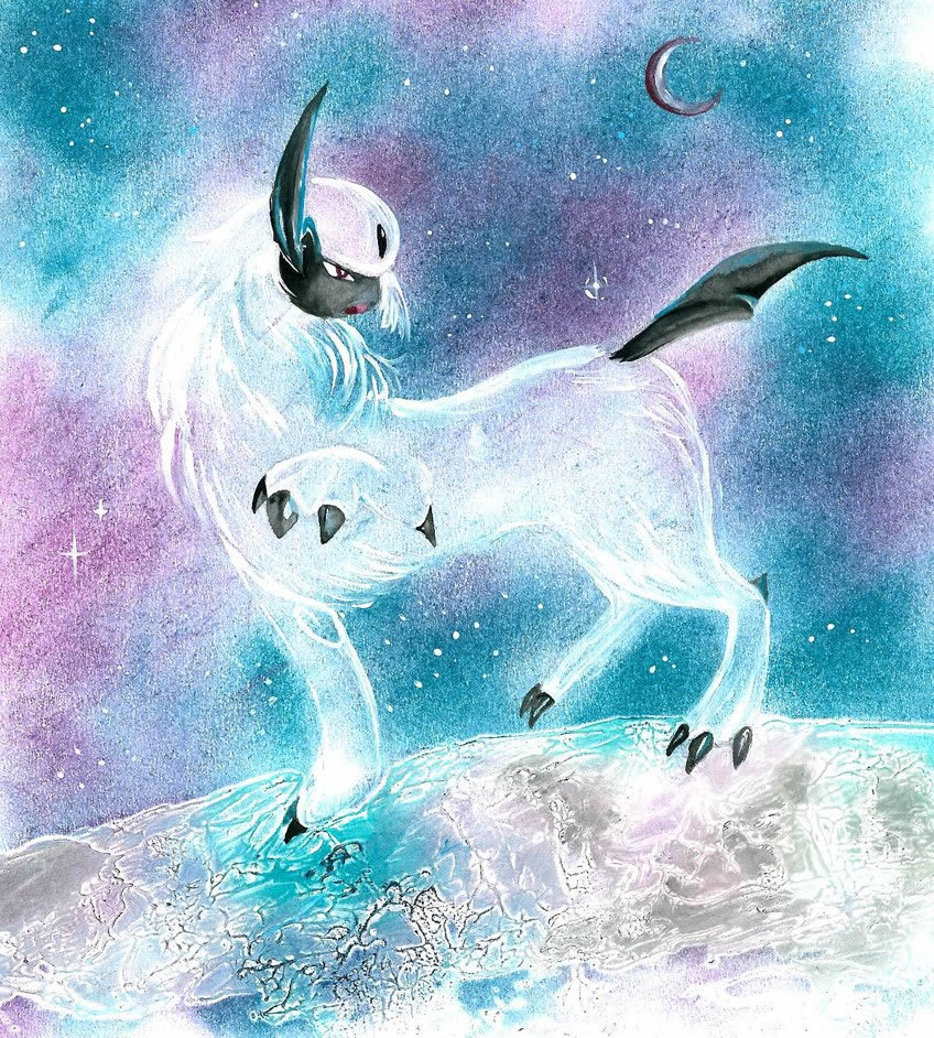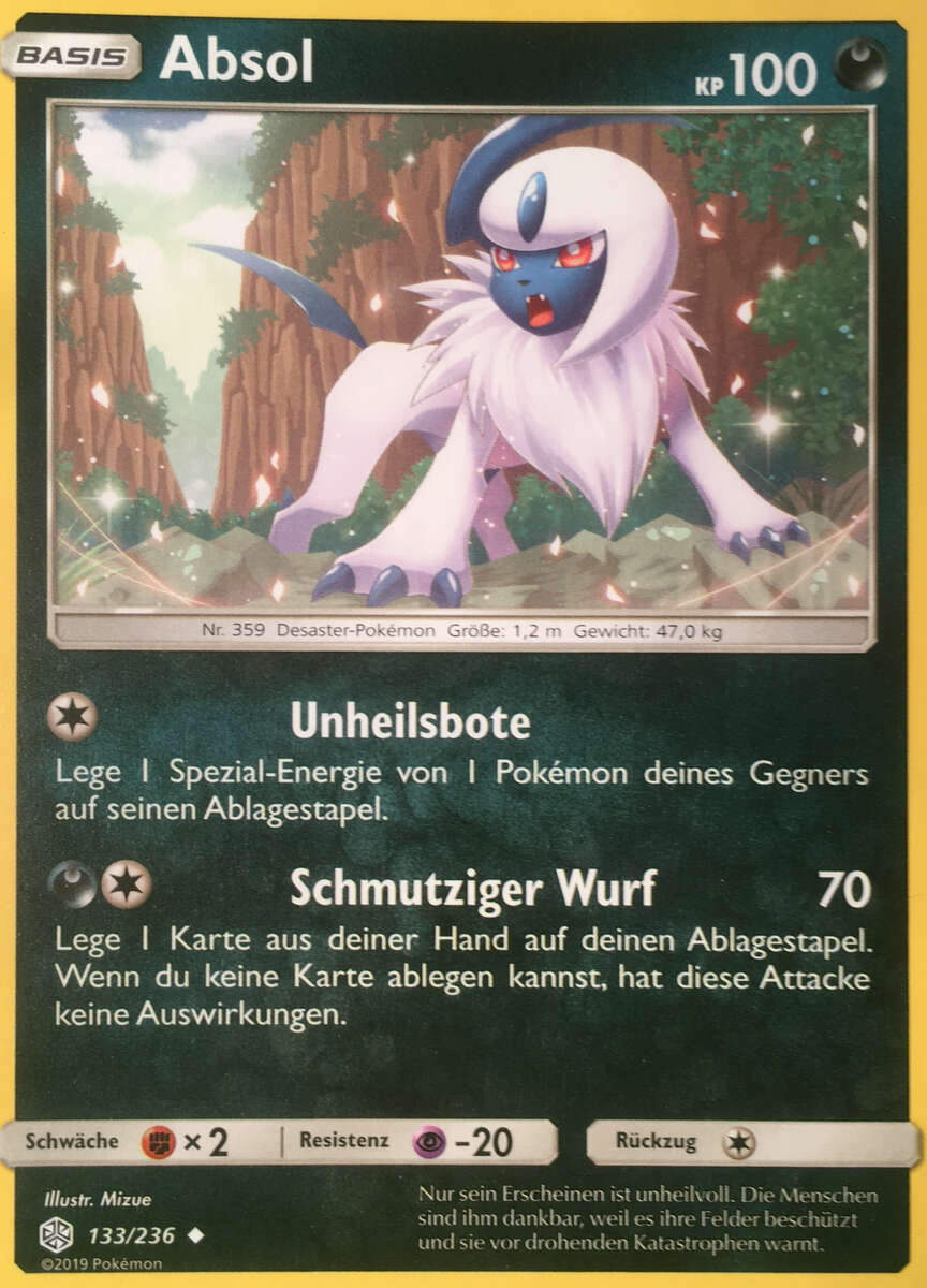 - S Aus Aberglauben war Absol einst als Unheilsbote verhasst und wurde in die tiefsten Berge vertrieben.