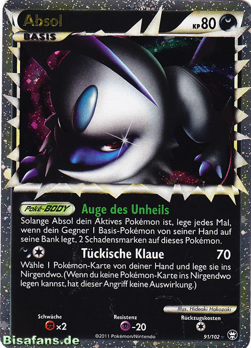 - AS Absol kann bevorstehende Naturkatastrophen voraussagen. Es lebt auf einem kargen, zerklüfteten Berg. Dieses Pokémon wagt sich nur sehr selten ins Tal herunter.