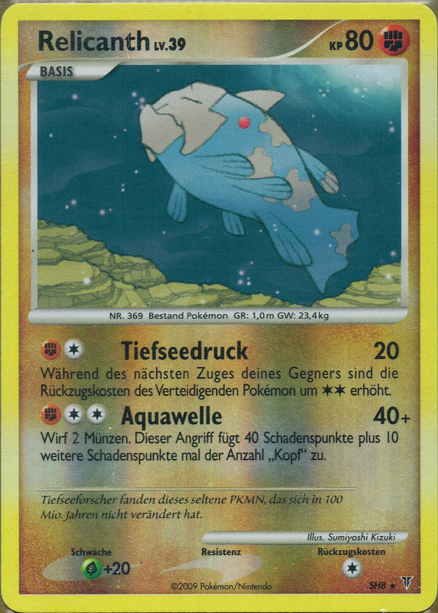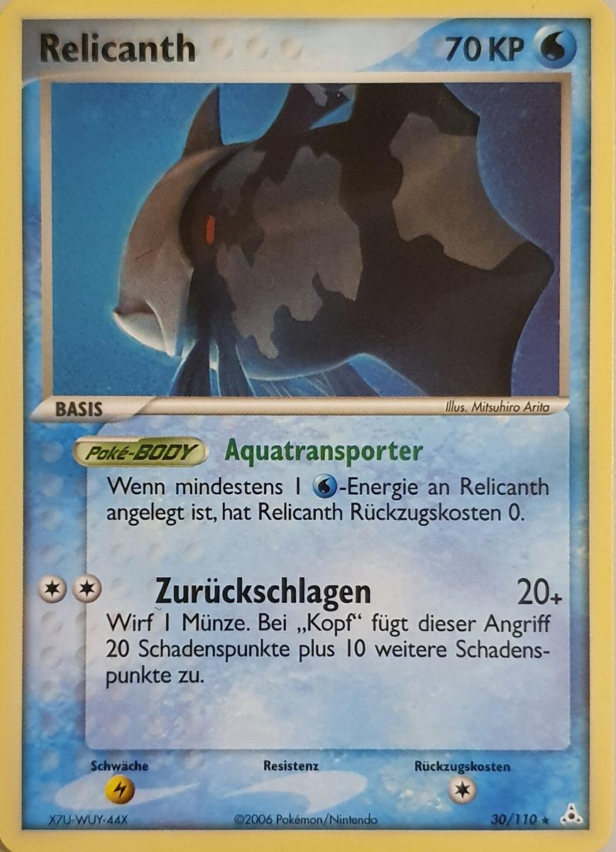 - AS Relicanth ist eine seltene Art, die auf einer Tiefsee-Expedition entdeckt wurde. Dieses Pokémon hält dem enormen Wasserdruck des Ozeans stand. Sein Körper ist mit steinharten Schuppen bedeckt.