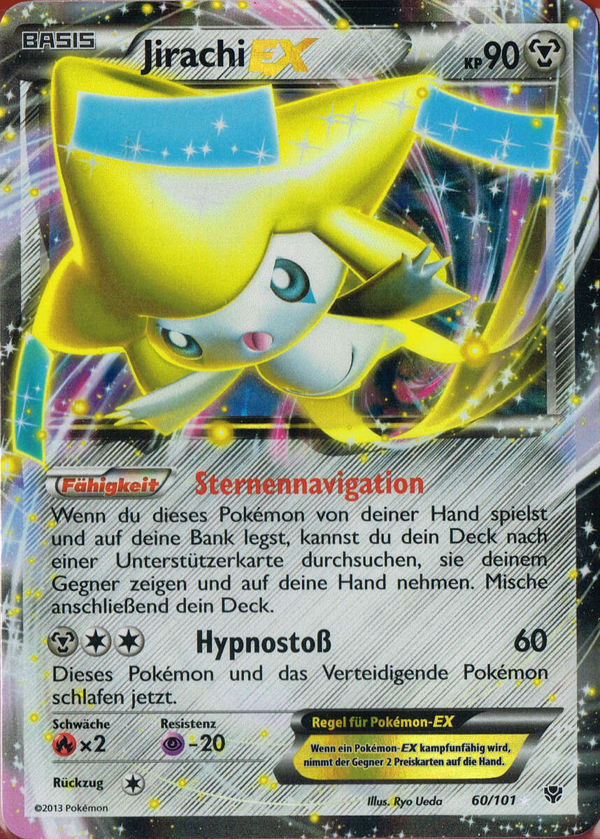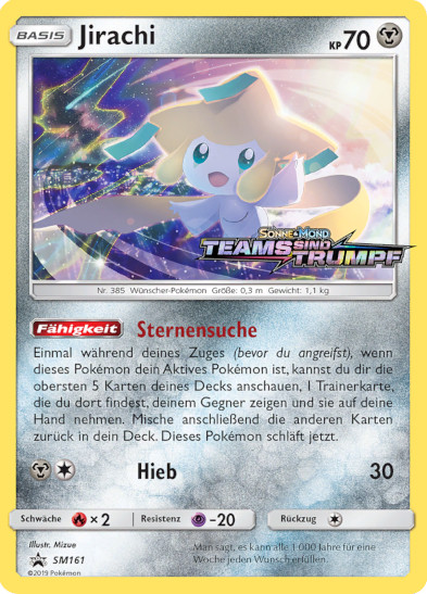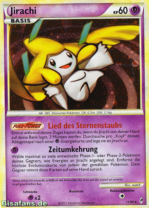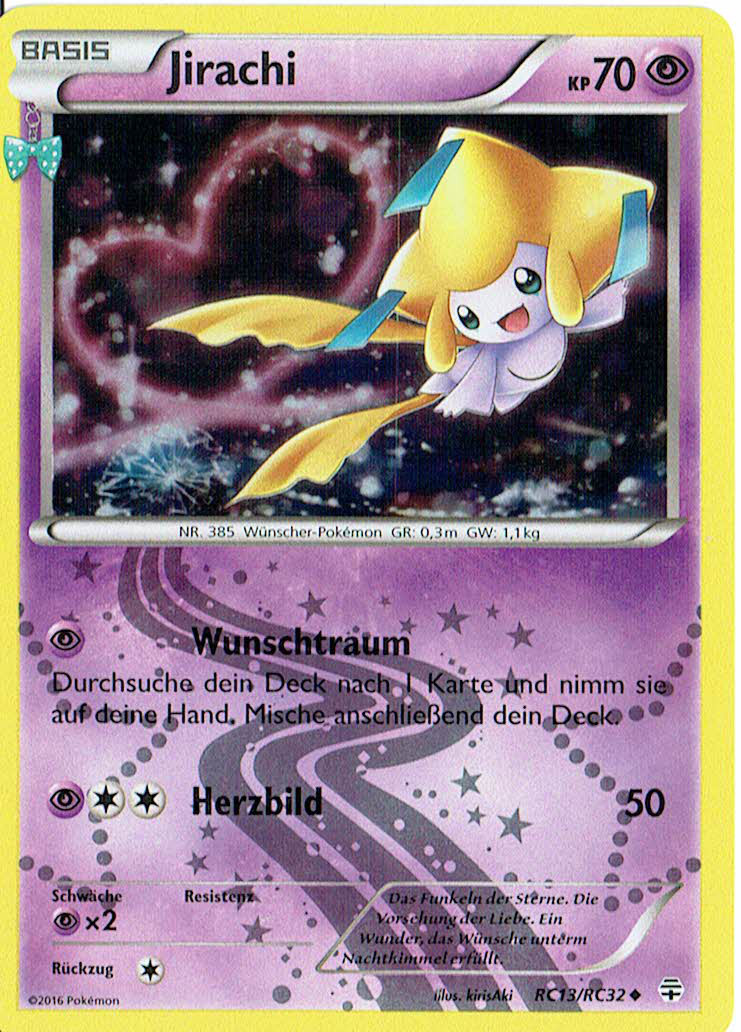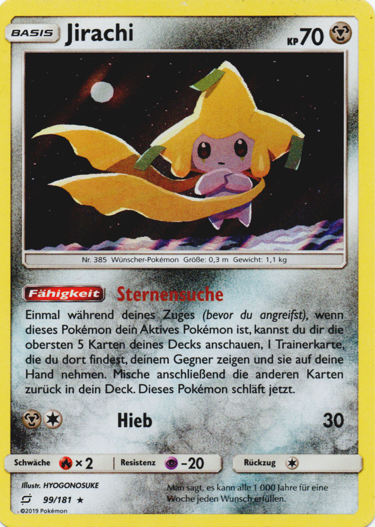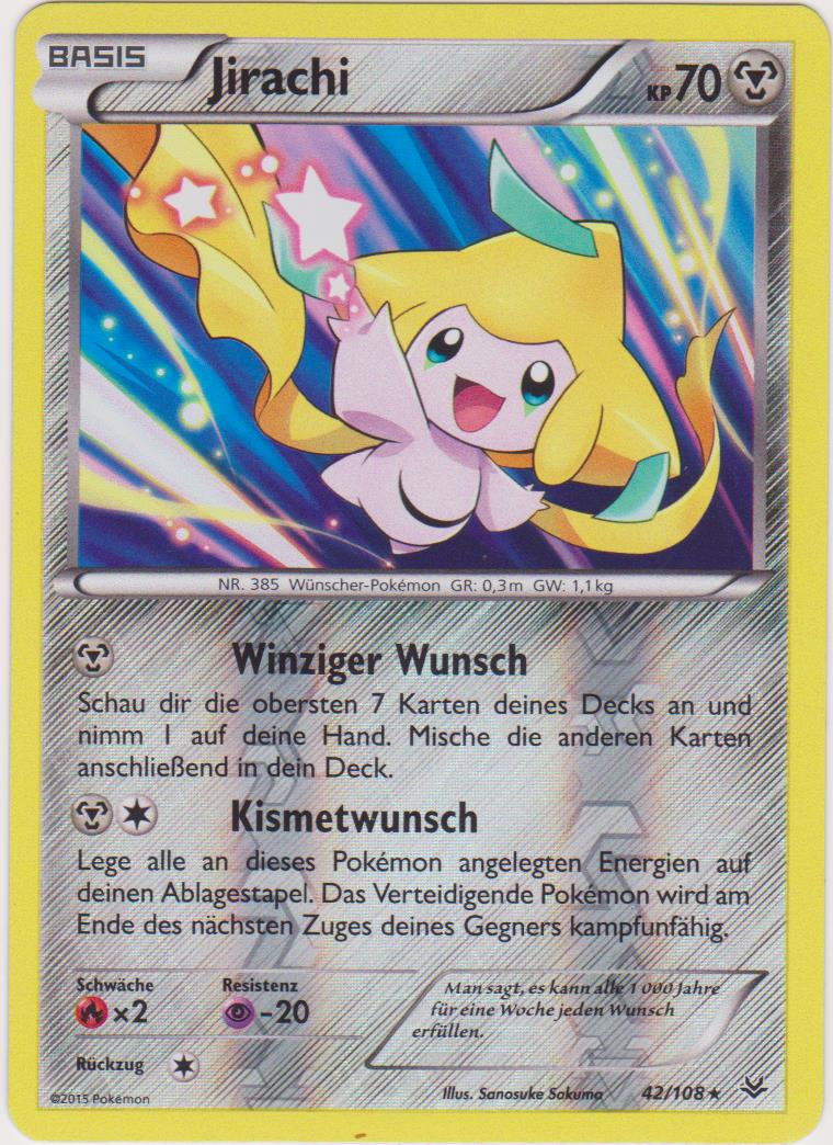 - R Einer Legende nach erfüllt JIRACHI jeden Wunsch, der auf einen Notizzettel an seinem Kopf geschrieben wird. Wenn dieses POKéMON Gefahr wittert, kämpft es bereits, bevor es überhaupt aufgewacht ist.