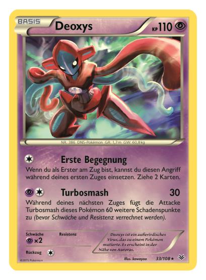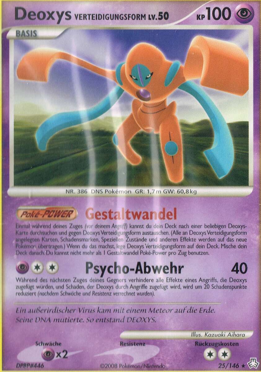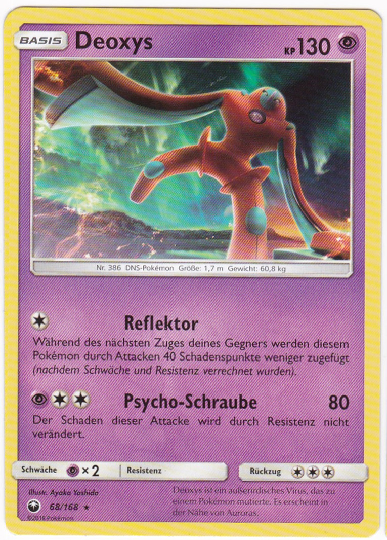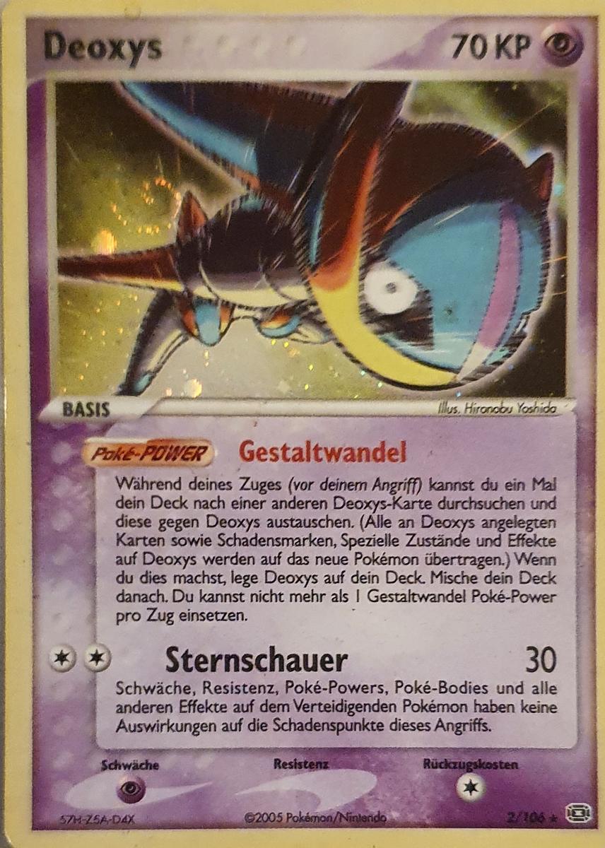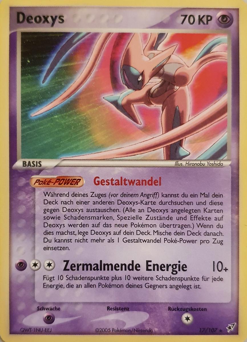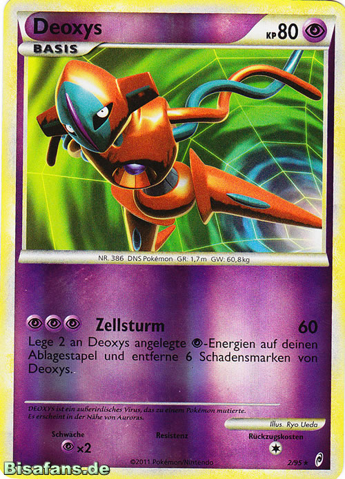 - OR Die DNS eines Weltraumvirus hat eine spontane Mutation erfahren, da sie einem Laserstrahl ausgesetzt wurde. Daraus entstand Deoxys. Das kristallartige Organ auf der Brust dieses Pokémon ist sein Gehirn.