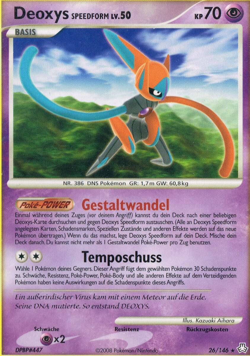- AS Deoxys ging aus einem Virus aus dem Weltraum hervor. Es ist sehr intelligent und nutzt psychokinetische Energie. Dieses Pokémon verschießt Laserstrahlen aus einem kristallartigen Organ auf seinem Brustkorb.
