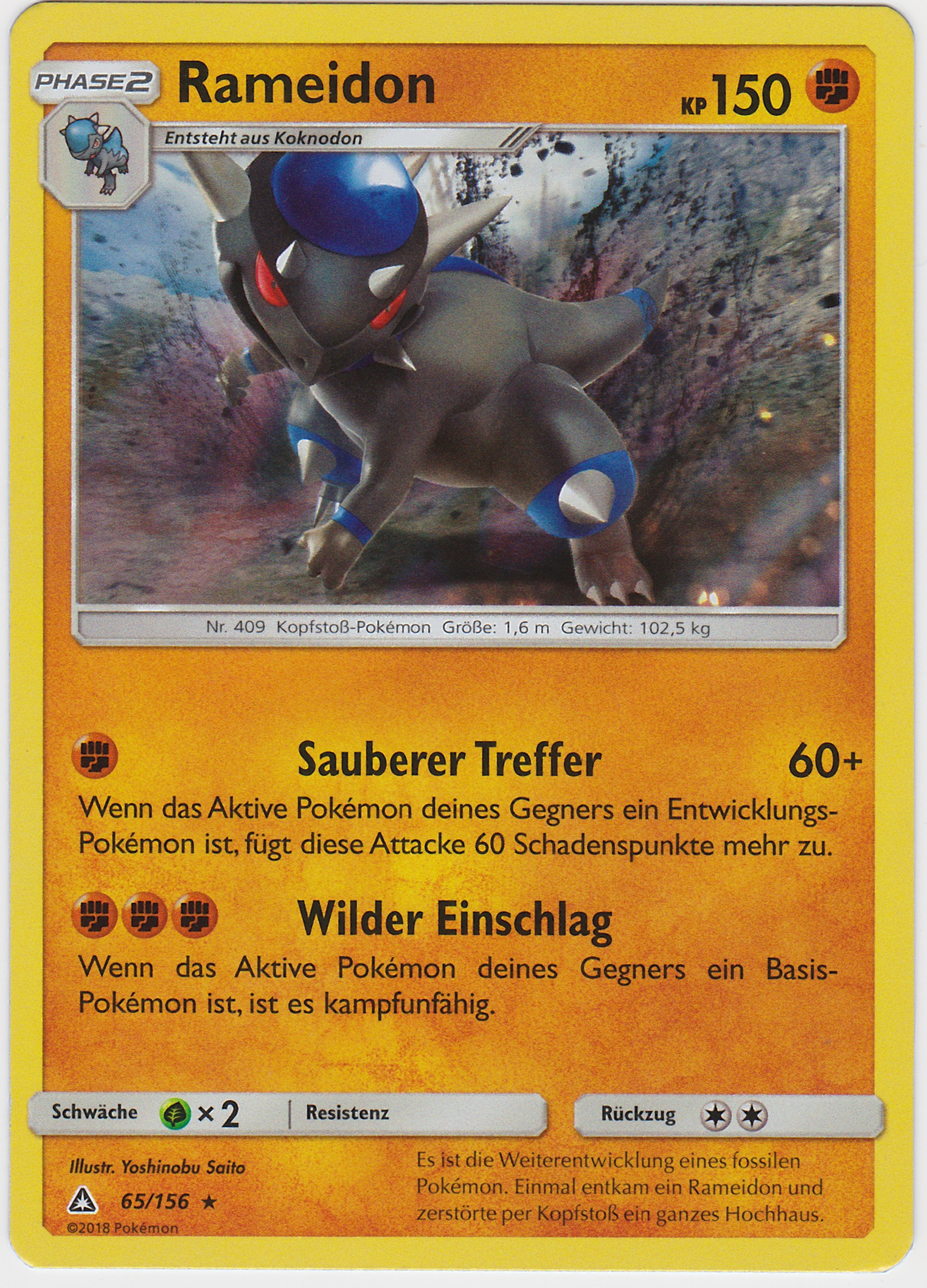 - NPS Dieses Pokémon rammt alles mit einem Kopfstoß. Dieser ist stark genug, um die ganze Höhle erzittern zu lassen, aber dank seines robusten Schädels verletzt Rameidon sich dabei nicht.