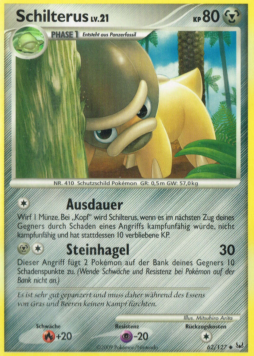 - LP Dieses Pokémon reibt sein hartes Gesicht an Baumstämmen, um es zu polieren. Gegen Angriffe von hinten ist es wehrlos.