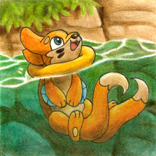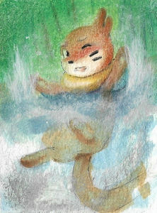 Mit geübter Leichtigkeit schwamm Bamelin dem untergehenden grünen Stein hinterher. Seine beiden Schweife nutzte es als Propeller, um schneller voranzukommen und seine Kraft vorerst zu schonen. Schließlich nahm es das funkelnde Objekt in seine Pfoten und bahnte sich einen Weg an die Oberfläche. Mit hohem Tempo sprang es aus dem Wasser und machte dabei einen Salto, bevor es wieder im kühlen Nass landete. In der Zwischenzeit hatte es jedoch Luft geholt und so seinen Schwimmreifen um den Hals aufgebläht, sodass es den Kopf oben halten konnte. Zufrieden hielt es den Stein in die Höhe.