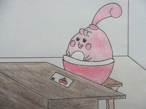 - Y Es hält den runden, weißen Stein für ein Ei und kümmert sich um ihn. Es achtet sehr auf seine Haarlocke.