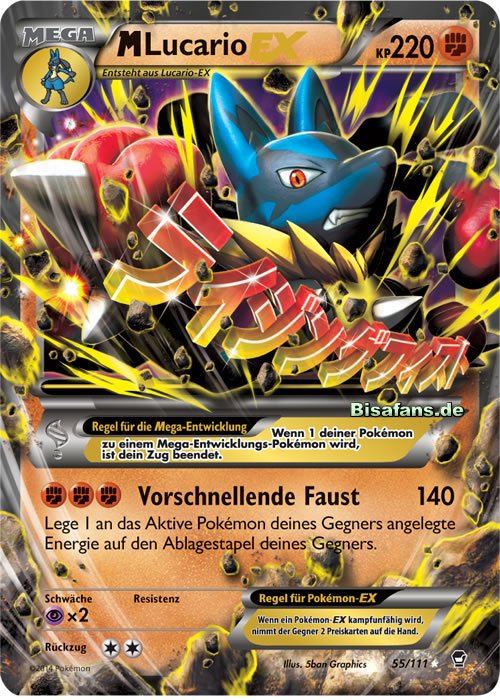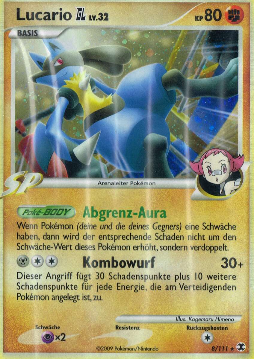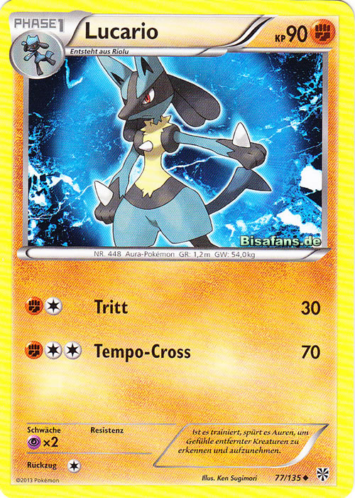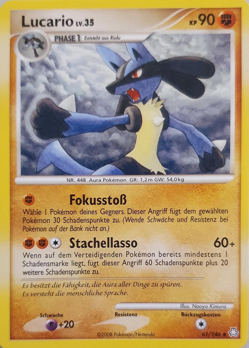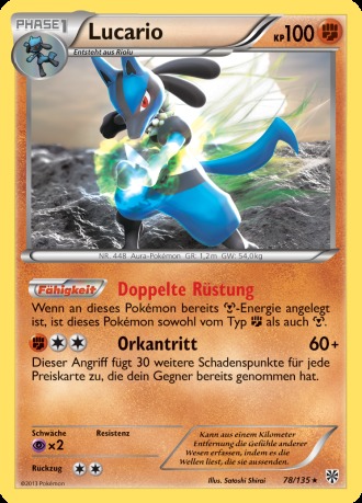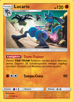 Lucario als Antwort auf viele Normaltypen wie Porygon2, Heiteira oder Relaxo und kann einem lästigen Toxin-Stall vom Leibe halten. Auch gegen Mega-Kangama eine gute Antwort, ansonsten nimmt es eine ähnliche Rolle wie Scherox ein. Schwerttanz um zu boosten, auf +2 kann man Durengard mit einem Erdbeben bezwingen.