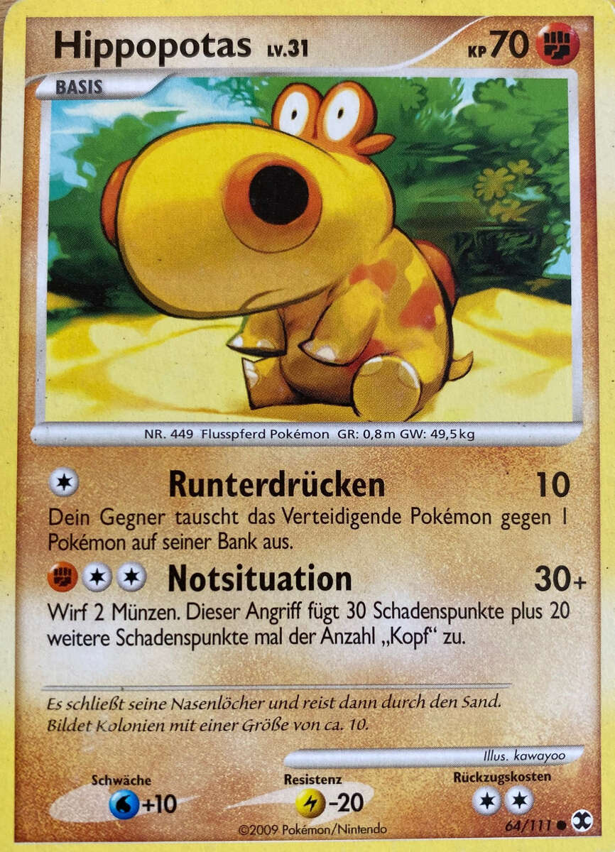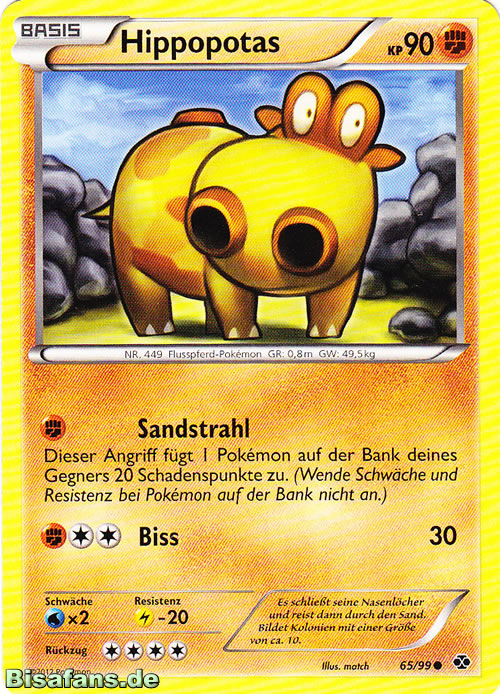 - K Dieses Pokémon schließt seine Nasenlöcher und reist dann durch den Sand. Es lebt in Kolonien mit einer Größe von circa zehn Hippopotas.