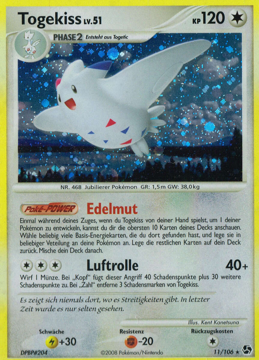 - HGSS Es heißt, Togekiss erscheine in friedlichen Zeiten und verteile alle möglichen Wohltaten.