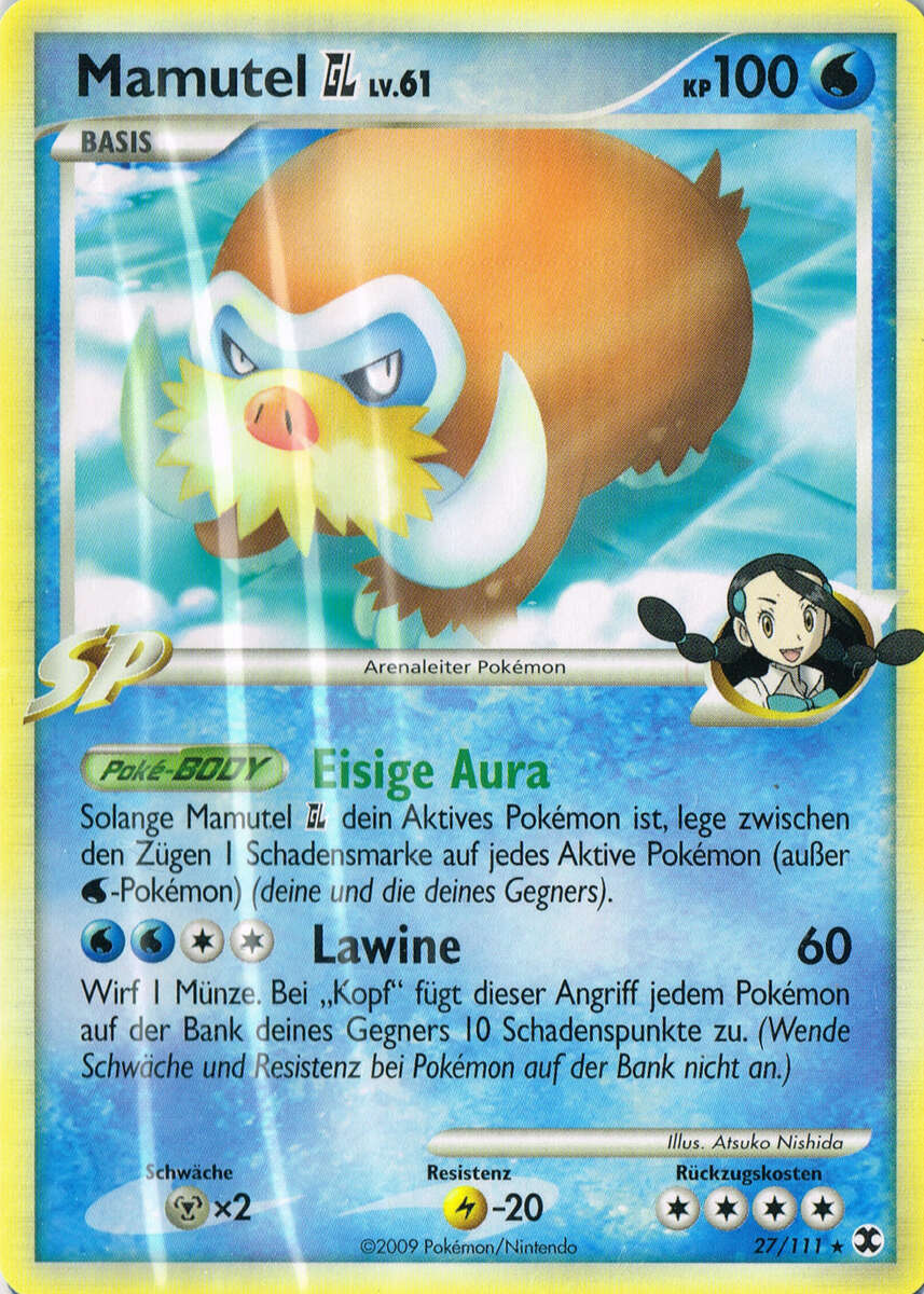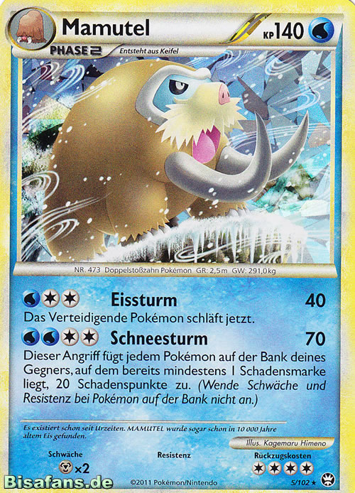 - DP Die beeindruckenden Stoßzähne dieser PKMN sind aus Eis. Nach der Eiszeit nahm ihre Population ab.