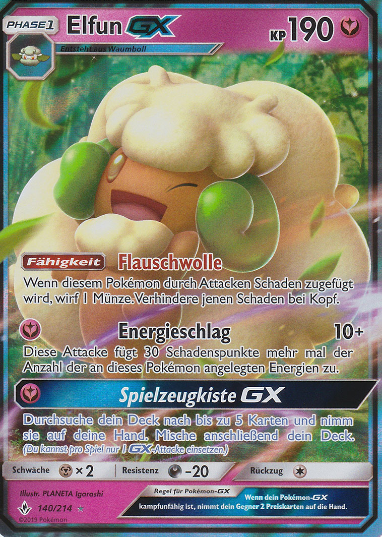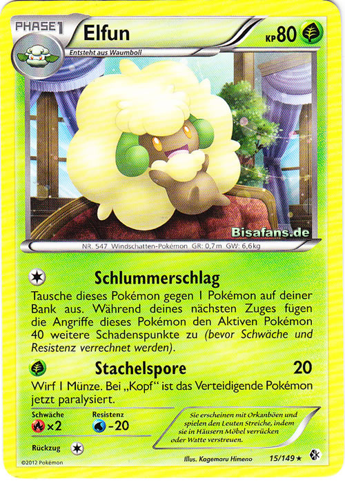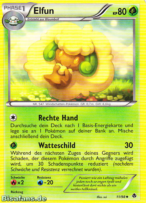 An diesem Pokémon hat sich nicht viel geändert seit es existiert. Immer noch so nervig wie früher, erlaubt es Strolch, Statusattacken mit um +1 erhöhter Priorität einzusetzen. Dabei soll Elfun hauptsächlich den Rückenwind beschwören. Notsituation kann einen ordentlich Schaden machen, besonders, wenn Elfun bereits seinen Fokusgurt verbraucht hat. Zugabe bestraft den Einsatz von Schutzschild oder Setup, während Verhöhner dies von vornherein verhindert bzw. den Gegner zu Verzweifler zwingt, wenn er bereits von Zugabe betroffen ist. Wenn man überwiegend Probleme mit Double Duck (Pelipper + Entoron) hat, kann man auch über Sonnentag als Attacke nachdenken, um Entorons Super-Wassertornado zu negieren und seine Initiative zu halbieren. Wer's braucht kann auch mit Trugträne die gegnerische Spezialverteidigung stark senken, um dann diesen Slot mit dem Partner umzuwummern. Rechte Hand ist auch eine Option und hat prinzipiell dasselbe Ziel wie Trugträne. Empfehlen würde ich die genannten Alternativen für den dritten oder vierten Attackenslot.