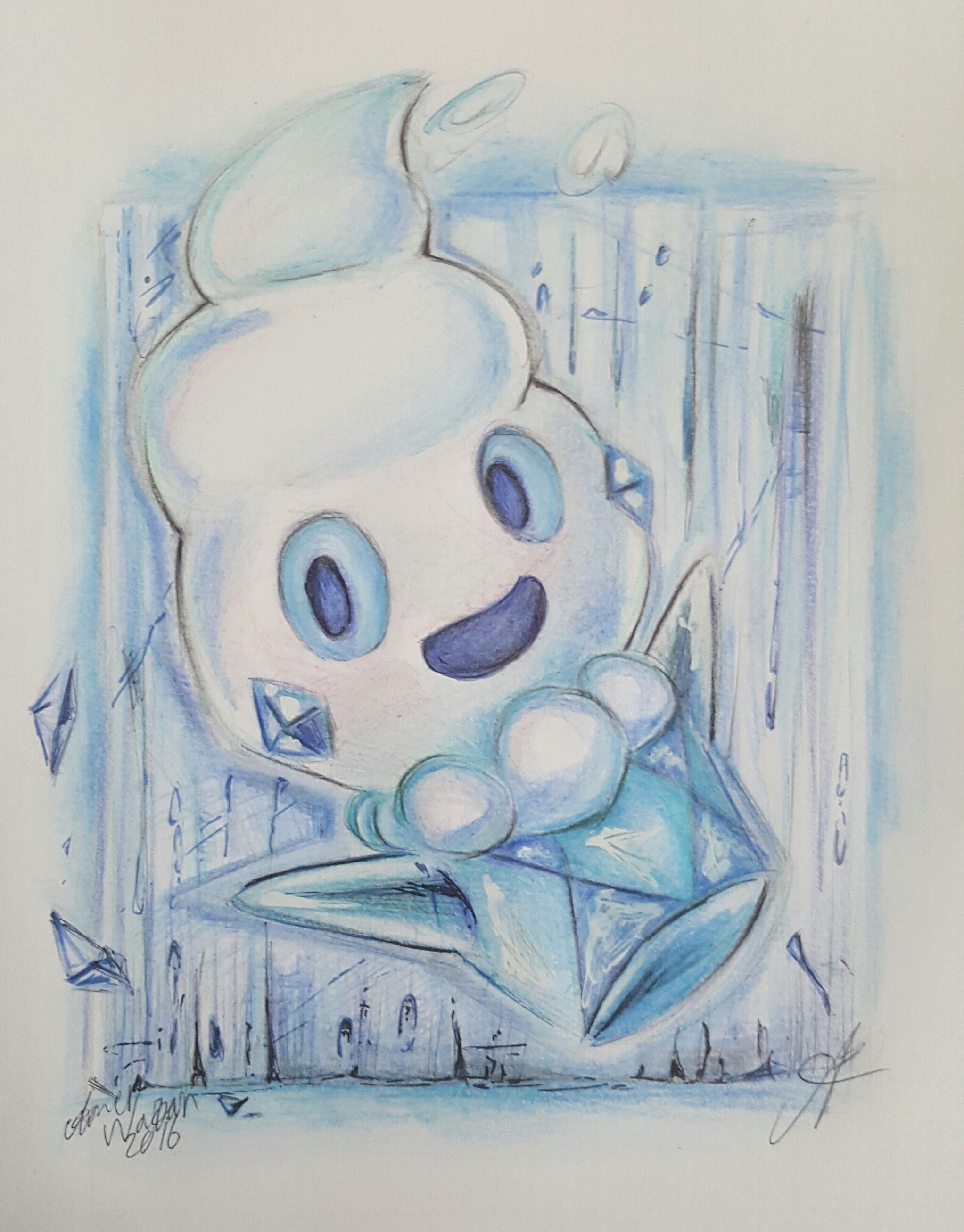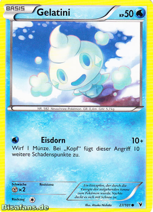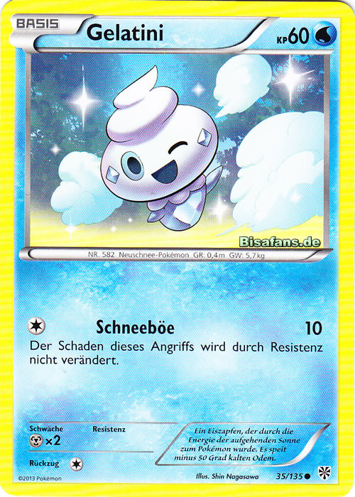 - S Dieses Pokémon ist aus einem Eiszapfen entstanden. Mit seinem kalten Odem erzeugt es Eiskristalle und lässt es schneien.