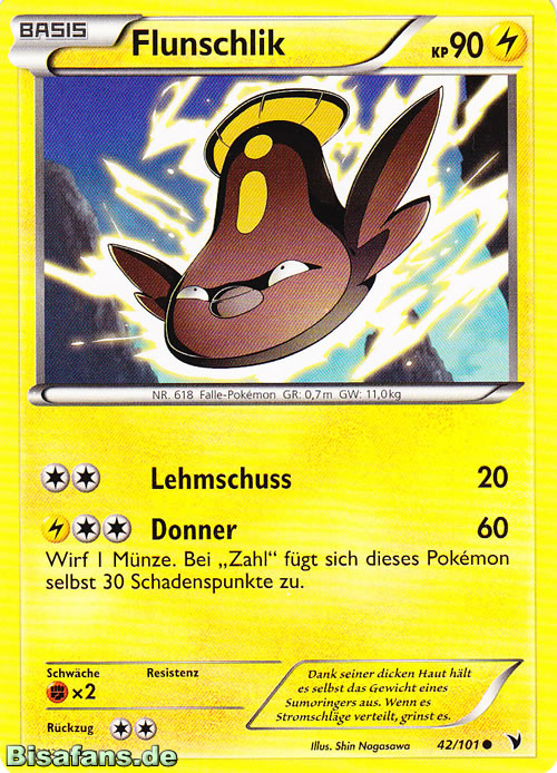 - SW Dieses Pokémon lebt im Morast. Dank der dortigen Bakterien hat es ein Organ entwickelt, mit dem es Strom erzeugen kann.