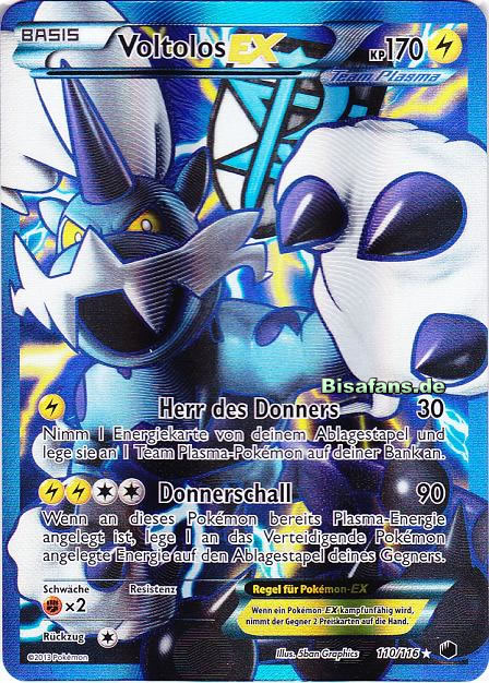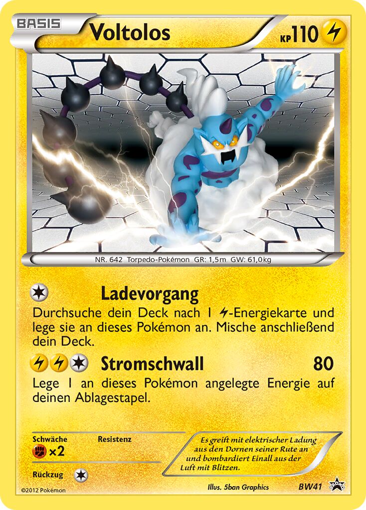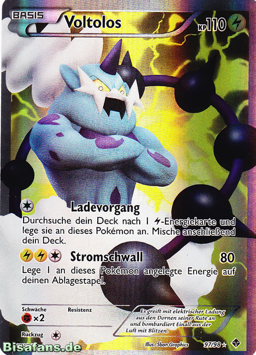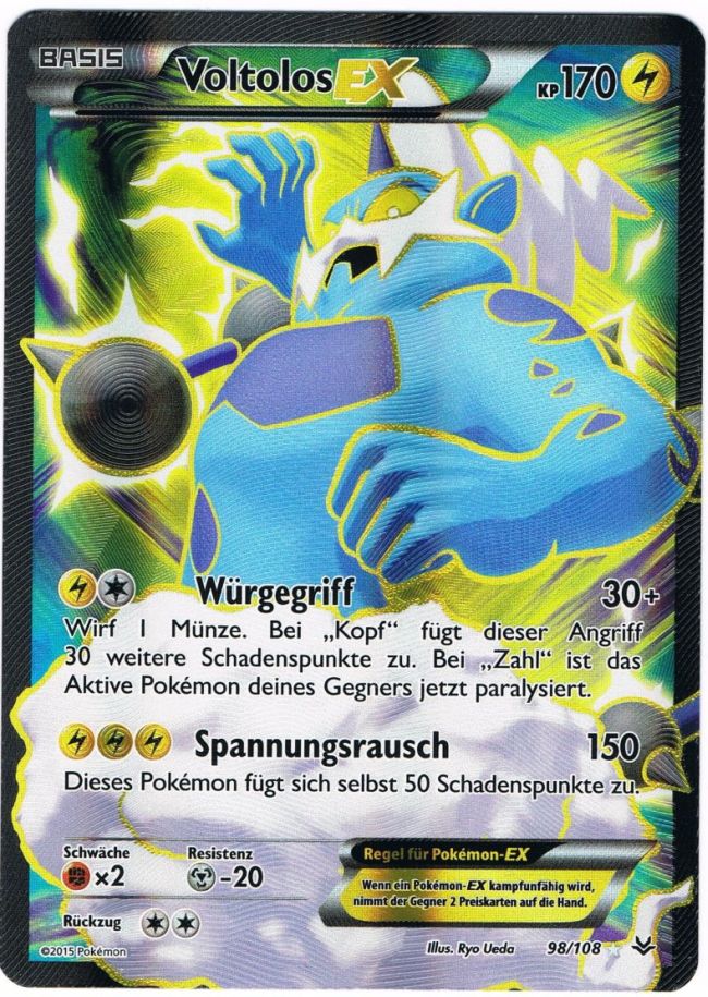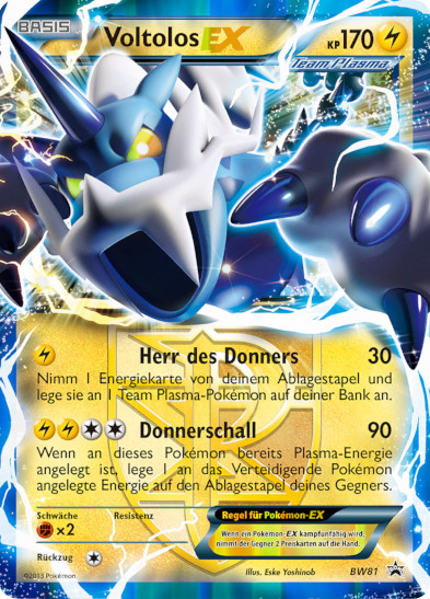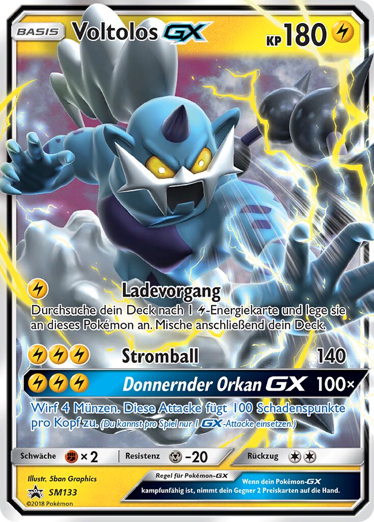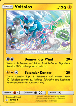 Voltolos, welches durch den Nerf von Donnerwelle eigentlich seltener gespielt wird, erhält im VGC 2018-Modus aufgrund verschiedener Faktoren wieder eine Existenzberechtigung: Zum einen kann es mit Regentanz den Regen bringen und somit Sweeper wie Kappalores oder Mega-Sumpex in Szene setzen (mit letztem harmoniert es dank der Bodenimmunität besonders gut) und zum anderen besteht durch den Z-Kristall die Möglichkeit eine treffsichere und definitiv k.o.-bringende Möglichkeit zu haben den nervigen Gegenspieler Despotar zu besiegen. Mit Z-Fokusstoß kann es dieses auf jeden Fall OHKOn. Donnerblitz gilt als der Standard-Angriff, der auch außerhalb des Regens funktioniert, wobei auch Donner als stärkerer STAB durchaus spielbar ist. Auf dem letzten Slot befindet sich obligatorisch Schutzschild, welches nach Belieben durch bspw. Verhöhner (gegen Rückenwind, Bizarorraum o.ä.), Kraftreserve Eis (gegen Demeteros-T) oder ebenfalls durch Donner ersetzt werden kann. Der EV-Split ist variabel; mit 172 Initiative-EVs überholt es harte/mäßige full-speed Base 100er wie bspw. Mega-Glurak-Y oder Mega-Kangama, allerdings ist auch weniger (oder mehr) spielbar, je nach Team. Ein guter Partner ist wie erwähnt Mega-Sumpex, welches frei Erdbeben drücken kann und zudem davon profitiert, dass Voltolos Wasserpokémon wie Milotic besiegen kann. Der Kombination fehlt noch eine Möglichkeit Pflanzenpokémon wie Hutsassa zu besiegen, weshalb ein Flugpokémon eine weitere gute Ergänzung ist und bereits einen guten offensiven Raincore darstellt.