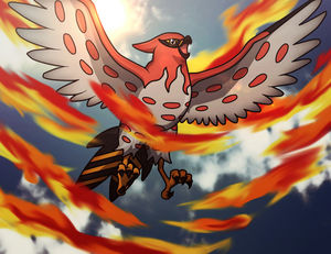 - P Ist es aufgeregt, versprüht es Funken aus den Zwischenräumen seines Gefieders. Seine Federn werden als feuerfestes Material verwendet.