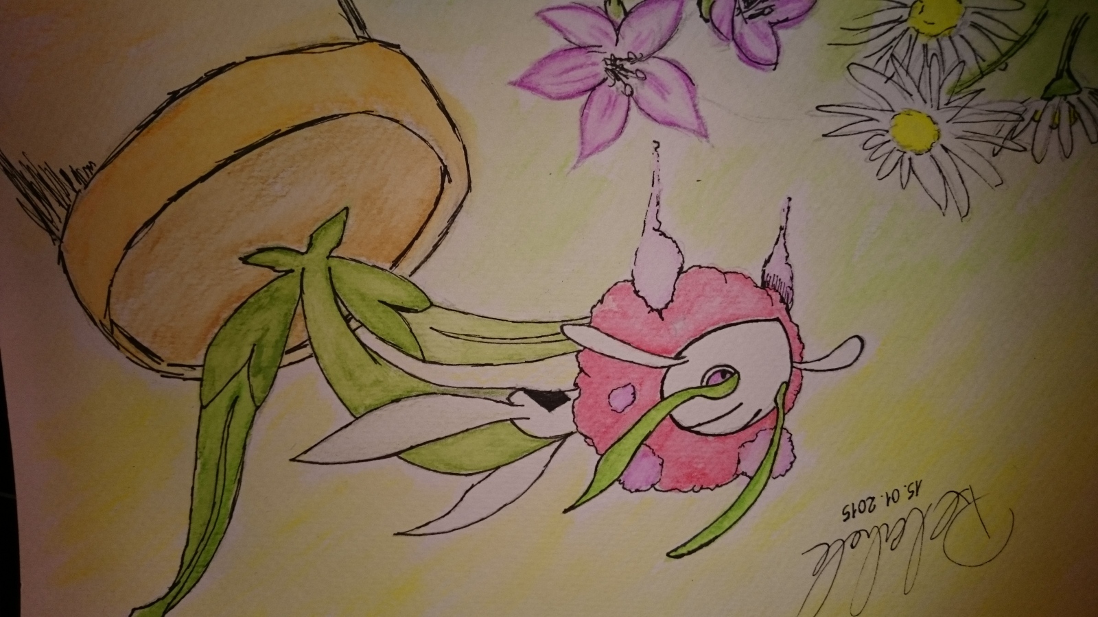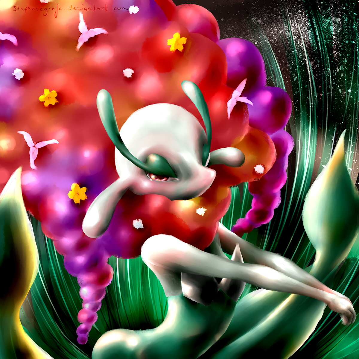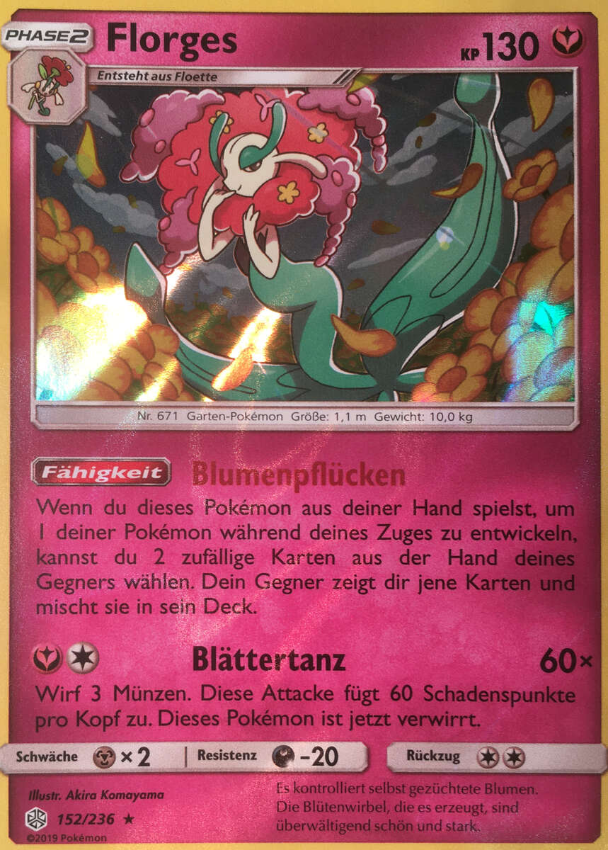 - K In seinem Revier legt Florges einen prächtigen Blumengarten an. Es schöpft seine Kraft aus den roten Blumen um seinen Hals.