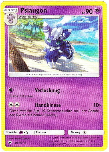 - SH Männliche Psiaugon haben einen ausgeprägten Beschützerinstinkt. Sie sind dann am stärksten, wenn sie sich oder ihren Trainer verteidigen.