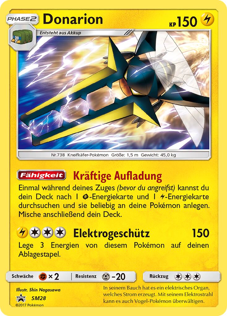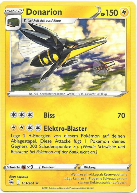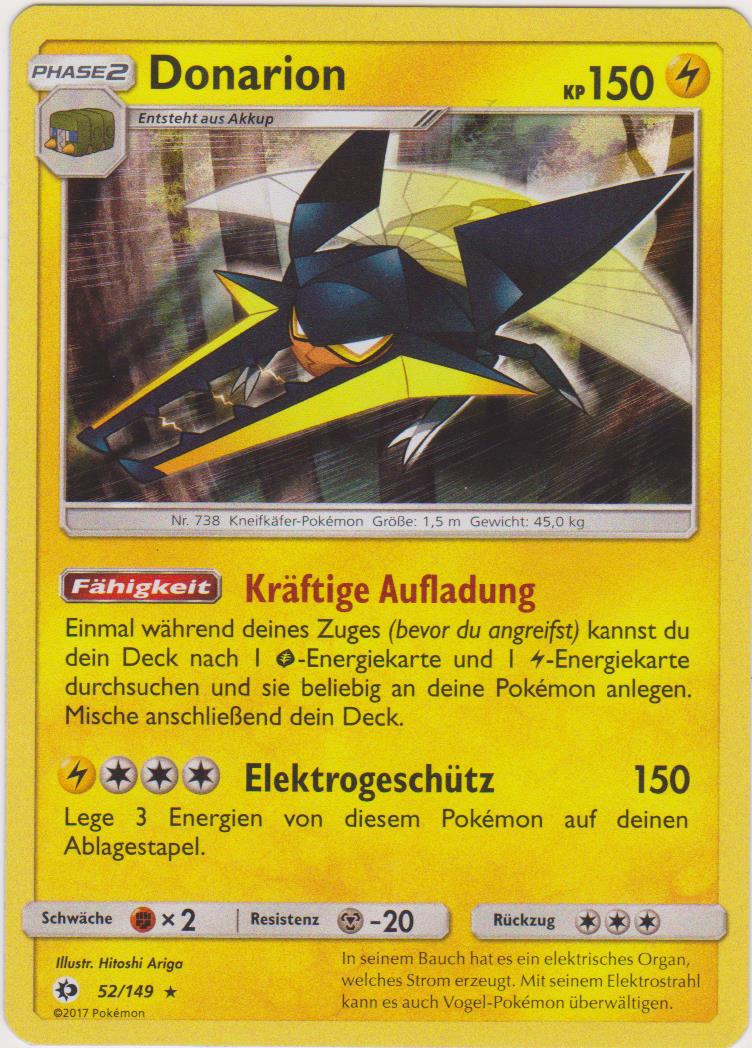 Im Gegensatz zur Bizarroraum-Variante steuert dieses Donarion selbst die Angriffsreihenfolge mit Fadenschuss, welcher im Doppelkampf die Initiative beider Gegner um zwei Stufen senkt. Wenn einem der Damage Output zu gering ist, kann man auch die EVs auf 252 SpA / 4 SpV / 252 Init ändern und das Item durch einen Fokusgurt ersetzen. Dadurch wird aber die Langlebigkeit reduziert. Der obige EV-Split garantiert das Überleben von Brutalandas Drastischem Drachendröhnen (ebenso wie dessen Flammenwurf), auch Arkanis Flammenwurf wird sicher überstanden.