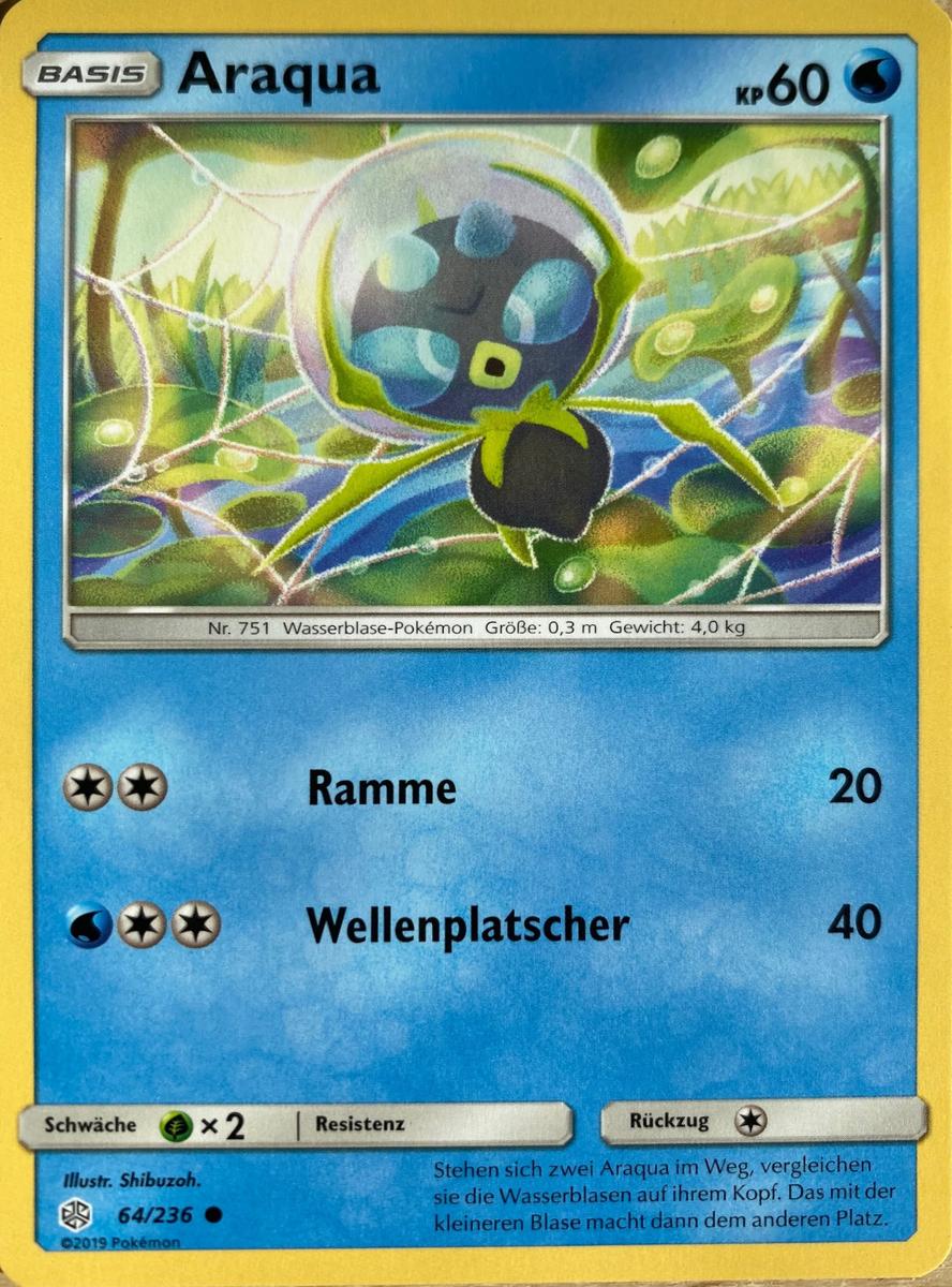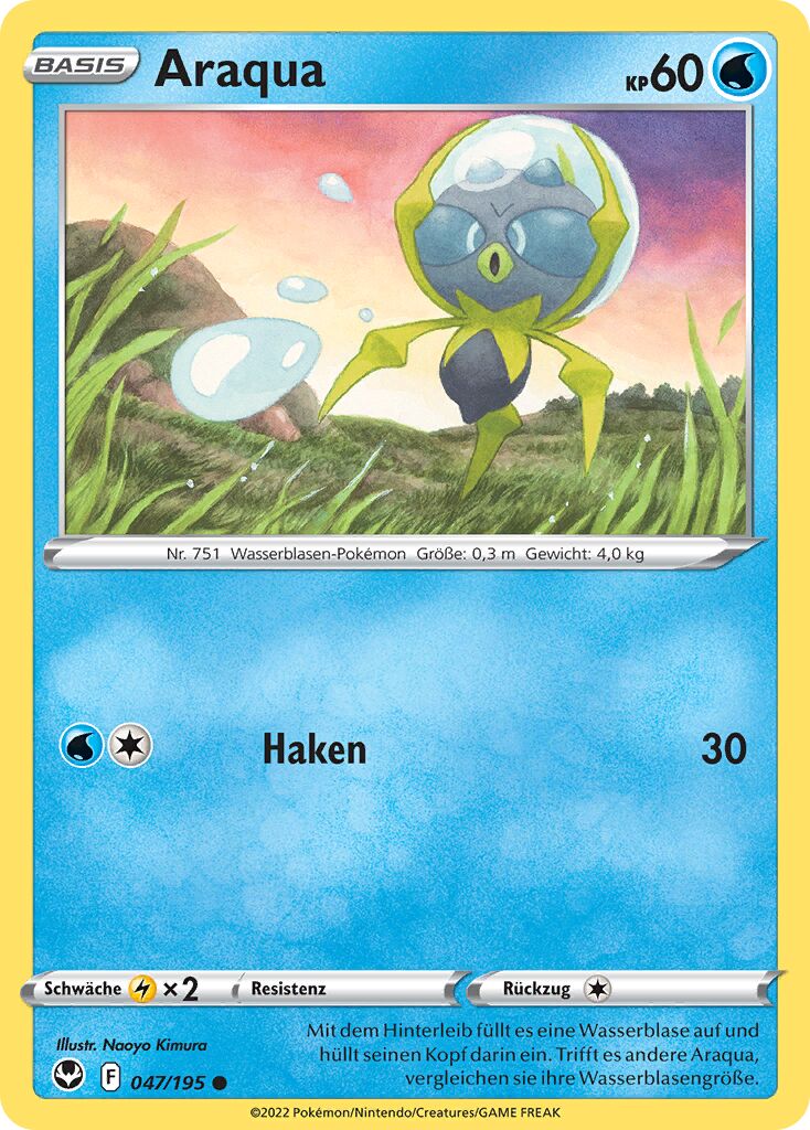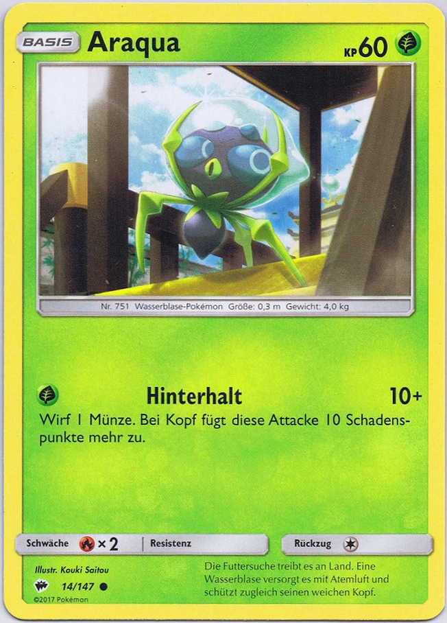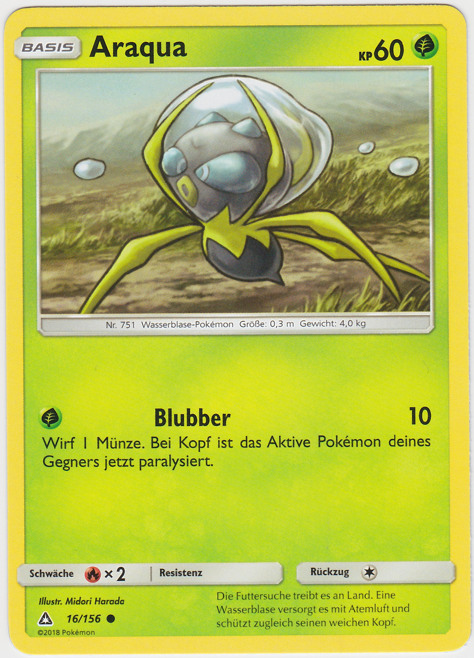 - Araquas Pokédexeinträge in Pokémon Sonne und Mond widersprechen sich. Während es in einem Spiel an Land eine Wasserblase nutzt, um zu atmen, zerstört es diese im anderen Spiel, um seine Beute an Land mit Wasser zu bespritzen.
