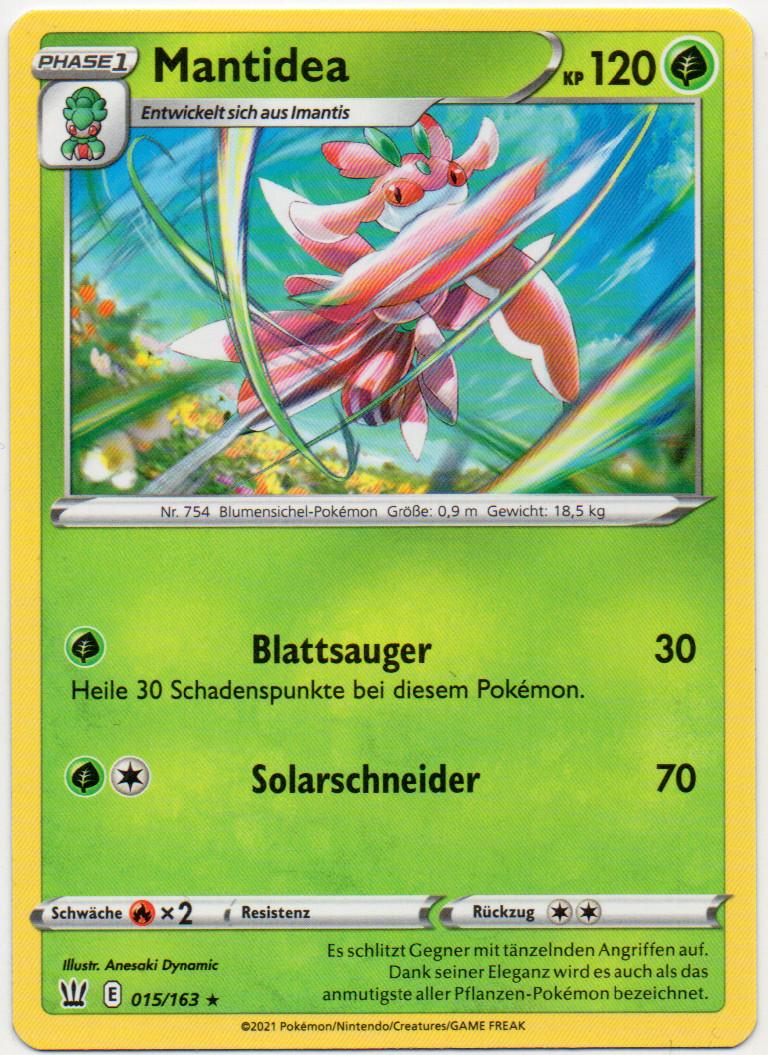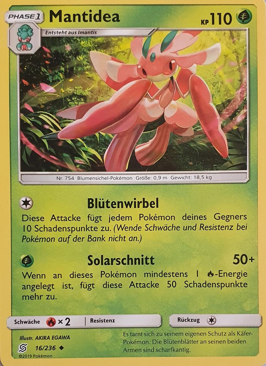 - SWRI Dieses Pokémon gleicht einer schönen Blume. Trainiert man es richtig, erstrahlt Mantidea zudem in überaus prächtigen Farben.