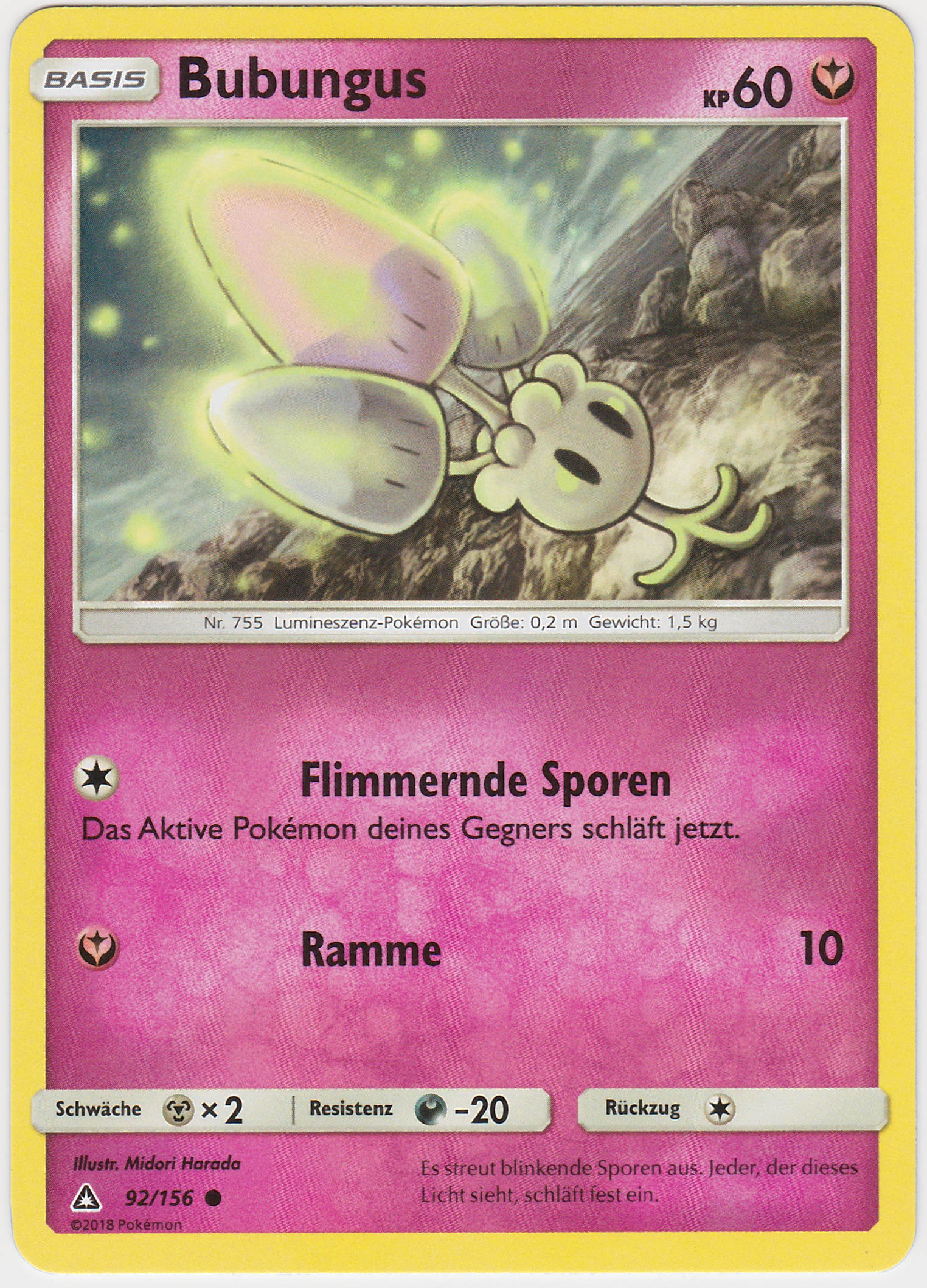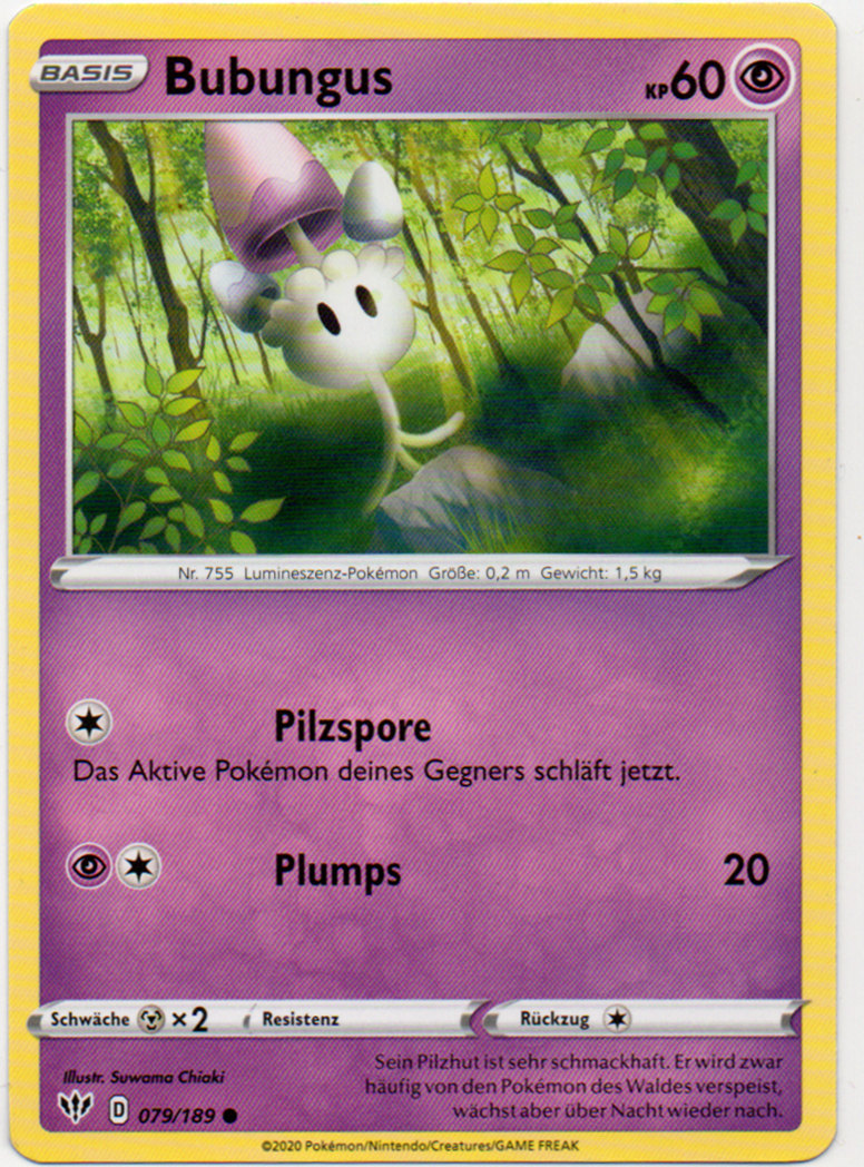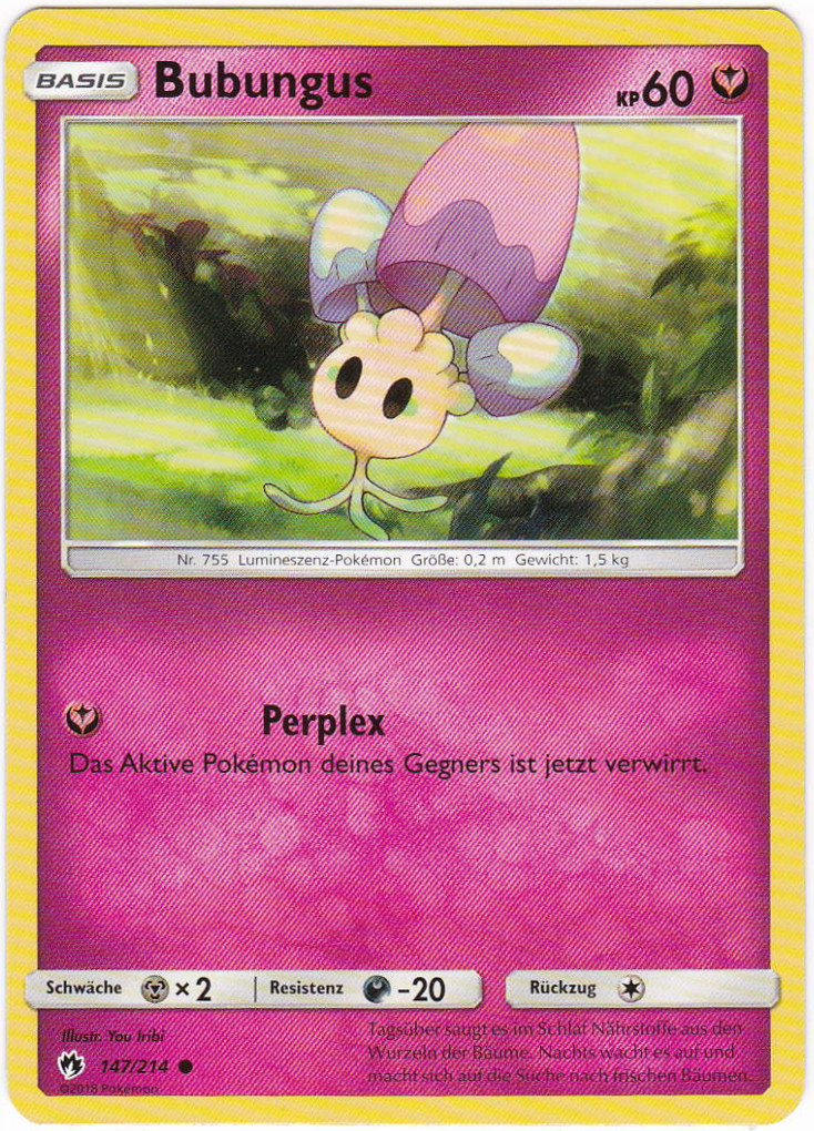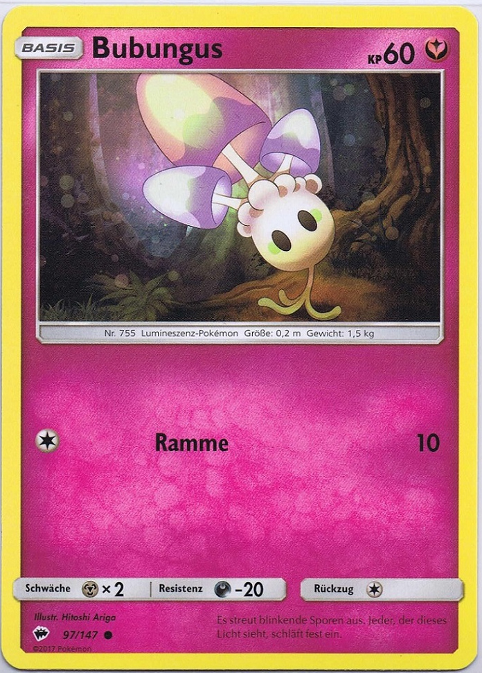 - SH Auch die hellsten Tage verbringt Bubungus in dunklen Wäldern. Es streut blinkende Sporen aus, um seine Gegner in den Schlaf zu lullen.