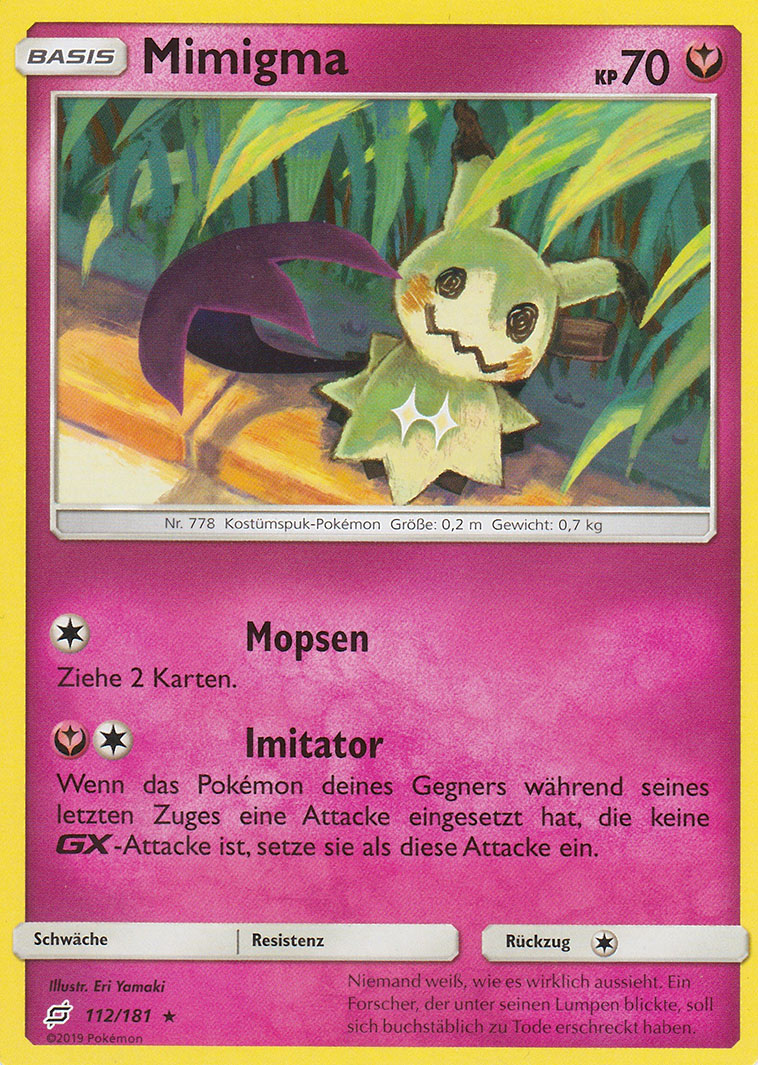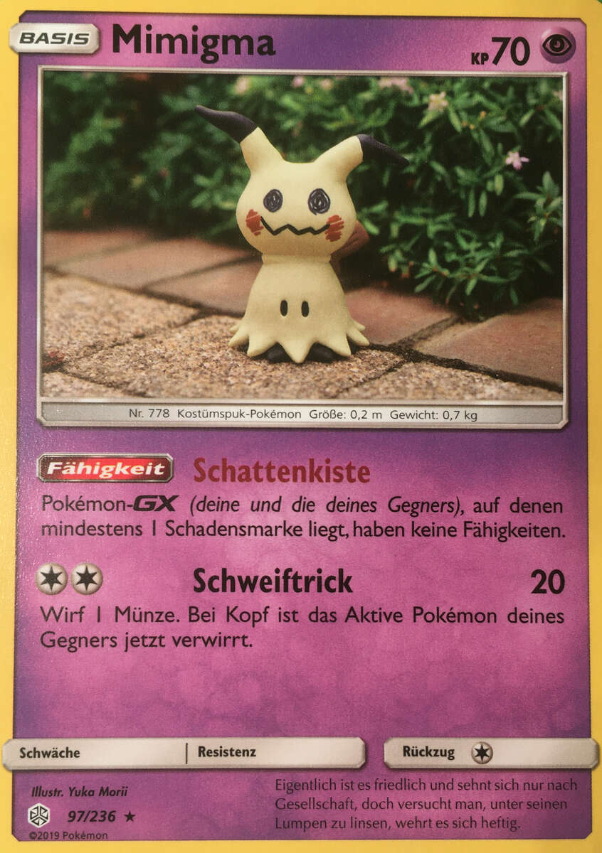 Die Kombination aus Kostümspuk und Mentalkraut macht Mimigma zu einem sehr potenten Bizarroraum-Beschwörer. Danach steht es dem Pokémon frei, ob es offensiv Druck ausüben, mit Irrlicht die gegnerische Angriffskraft drosseln oder doch mit Psycho-Plus den Angriffsboost von Freund- und Helferpartner Bauchtrommel Relaxo kopieren will, um dann den Gegner zu überwältigen.