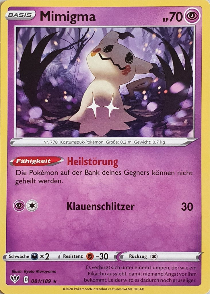 Mimigma ist zwar kein überragendes Pokémon, aber durch die Fähigkeit durchaus spielbar. Schwerttanz ist hier unabdingbar, da Mimigma den Angriffsboost dank Kostümspuk meist sehr sicher rausbringen kann und man problemlos auf +2 kommen kann. Knuddler ist als Feen-STAB gesetzt, Schattenstoß ist ein STAB mit Priorität und auf dem letzten Slot kann man sich zwischen Abgangsbund und Dunkelklaue entscheiden. Dunkelklaue macht noch mal einiges mehr Schaden als Schattenstoß und sorgt für ein solides Matchup gegen Durengard. Die Attacke kann auch mit Phantomium Z gespielt werden, dann richtet sie nach einem Schwerttanz auch auf Kaguron, das sonst ohne Probleme gegen Mimigma gewinnen würde, guten Schaden an. Abgangsbund hingegen nimmt Kaguron und andere nervige Gegner mit, allerdings muss man Mimigma dafür auch opfern. Entscheidet man sich für Dunkelklaue, ist sowohl Leben-Orb als auch Phantonium Z spielbar, nimmt man allerdings Abgesang, so sollte man unbedingt den Leben-Orb spielen. Froh als Wesen ermöglicht das Überholen harter Mimigma und sämtlicher Wahlglas-Kapu-Fala, während man mit einem harten Wesen zwar generell mehr Schaden macht, dafür aber von frohen Mimigma und scheuen Kapu-Fala überholt wird und mit harten Mimigma einen Speedtie hat, deshalb ist es weitestgehend vom Team abhängig, für welches Wesen man sich entscheidet.