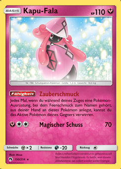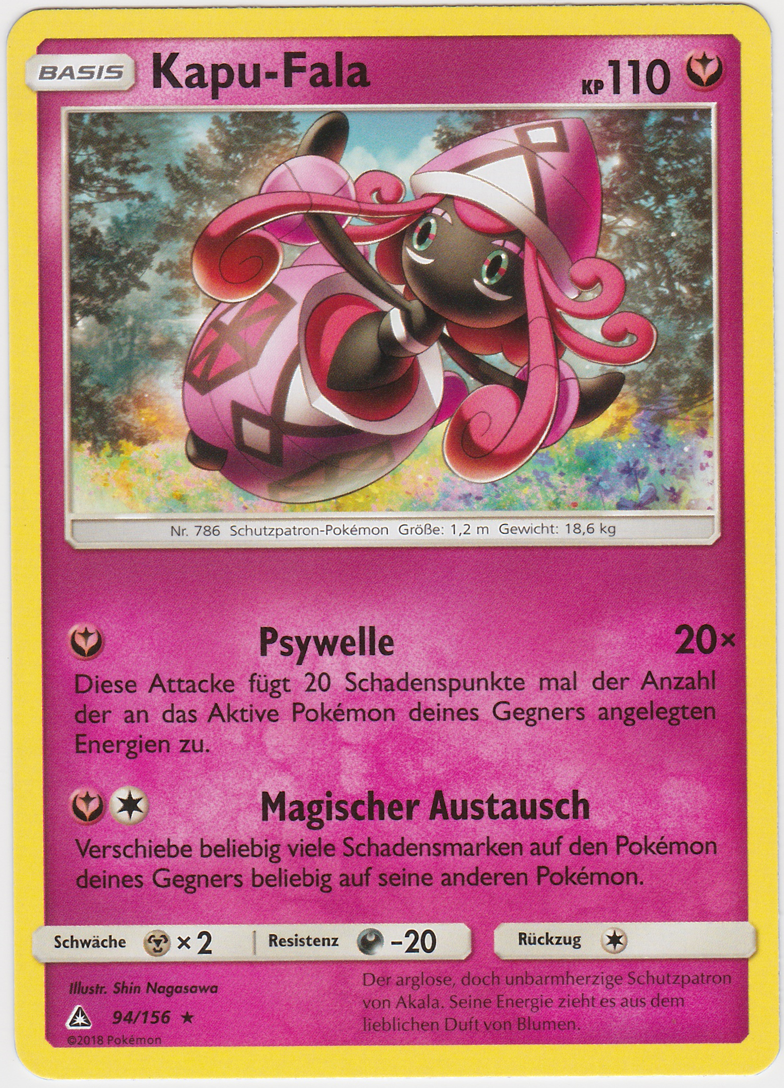 Kapu-Fala ist neben Kapu-Riki und Porygon2 das wohl aktuell beste Pokémon im Metagame, was unter anderem an der grandiosen Fähigkeit Psycho-Erzeuger liegt, welche nicht nur dafür sorgt, dass Kapu-Fala auf Psychoattacken quasi noch mal STAB bekommt, sondern auch, dass Prioritätsattacken verhindert werden, was vor allem gegen Schattenstoß von Mimigma und Durengard sehr nützlich ist. Zudem kommt ein hoher Basiswert im speziellen Angriff von 130, wodurch Kapu-Fala gepaart mit dem Wahlglas sowie im Falle einer Psycho-Attacke STAB sowie dem Boost durch das Psycho-Feld der wohl beste Lategame-Sweeper und Damage-Dealer des Metagames ist. Mit mäßigem Wesen besiegt es selbst speziell defensive Porygon2 mit zwei Treffern, und Durengard nimmt über 40% Schaden von Psychokinese. Ebenfalls zu Gute kommt Kapu-Fala der gute Movepool. Psychokinese ist als STAB gesetzt und meiner Meinung nach bei Weitem sinnvoller als Psychoschock, da auch Pokémon wie Porygon2 meistens physisch defensiv gespielt werden. Spukball ist der wohl beste Coverage-Move und damit ebenfalls gesetzt, einfach da Geister und Stahltypen die grösste Bedrohung für Kapu-Fala sind und Geister sehr effektiv und Stahlpokémon neutral von Spukball getroffen werden. Auf den anderen Slots sind wohl Donnerblitz, Mondgewalt, Kraftreserve Feuer sowie Fokusstoß die relevantesten Optionen, wobei Donnerblitz ein hervorragender Lure gegen Kaguron ist, welches zu den besten Antworten auf Kapu-Fala zählt. Mondgewalt bekommt zwar STAB, hilft bei der Coverage aber nicht groß weiter, da sich Fee / Psycho von der Effektivität sehr decken und es eigentlich mit Ausnahme von Mega-Garados und Quajutsu keine besonders relevanten Unlichtpokémon im aktuellen Metagame gibt, allerdings ist es in manchen Situationen einfach sicherer, im Late Game Mondgewalt zu drücken und auch gegen Kapu-Riki trifft das ganz gut, was auf jeden Fall nicht außer Acht gelassen werden sollte. Mäßig halte ich u.a. aufgrund des sicheren 2HKOs gegen Porygon2 für bedeutend besser als das alternativ spielbare scheue Wesen.