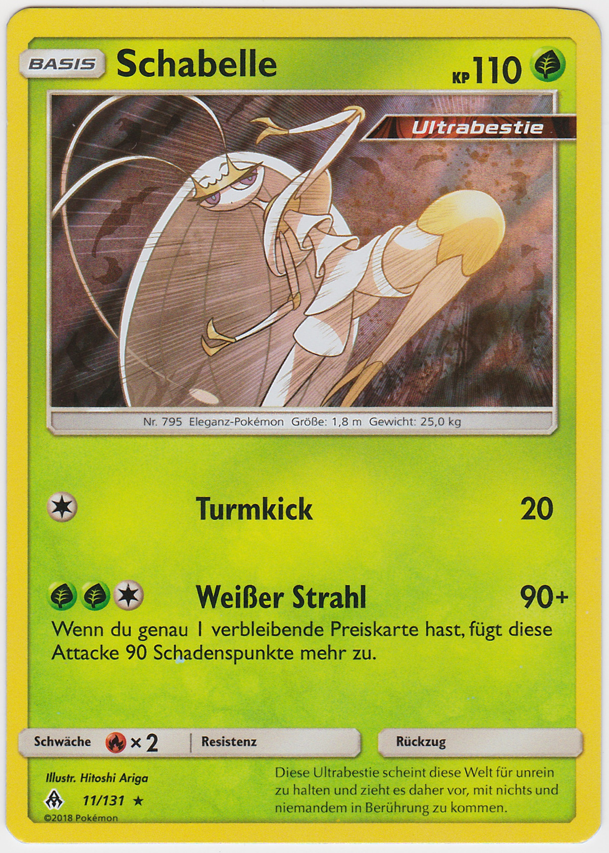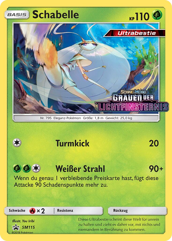 Schabelle ist superschnell und lebt von seiner hervorragenden Coverage. Fokusstoß ist mit Battalium Z ein Nuke, der außerdem immer trifft. Eisstrahl, um Demeteros und andere Flug Pokémon zu treffen. Käfergebrumm ist ein guter STAB, der Psycho-Pokémon wie Cresselia trifft und Kraftreserve Boden ist eine Option um einwechsende Mega-Gengar mit zwei Treffern zu besiegen. Turbodreher ist ein guter letzter Move und dank des überragenden Speeds kriegt Schabelle gegen fast jedes Pokémon einen Turbodreher raus, um Entry Hazards wie Tarnsteine oder Stachler zu enfernen. Gute Teampartner sind Pokémon wie Alola-Sleimok, um Durengard zu trappen und Morbitesse oder Digdri, um Aggrostella zu trappen. Das scheue Wesen garantiert, dass Pokémon wie Mega-Simsala und einige langsame Wahlschalträger überholt werden.