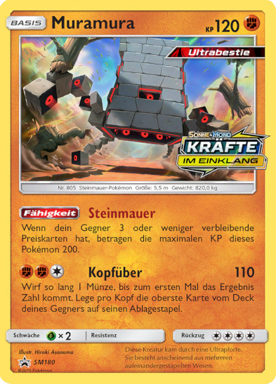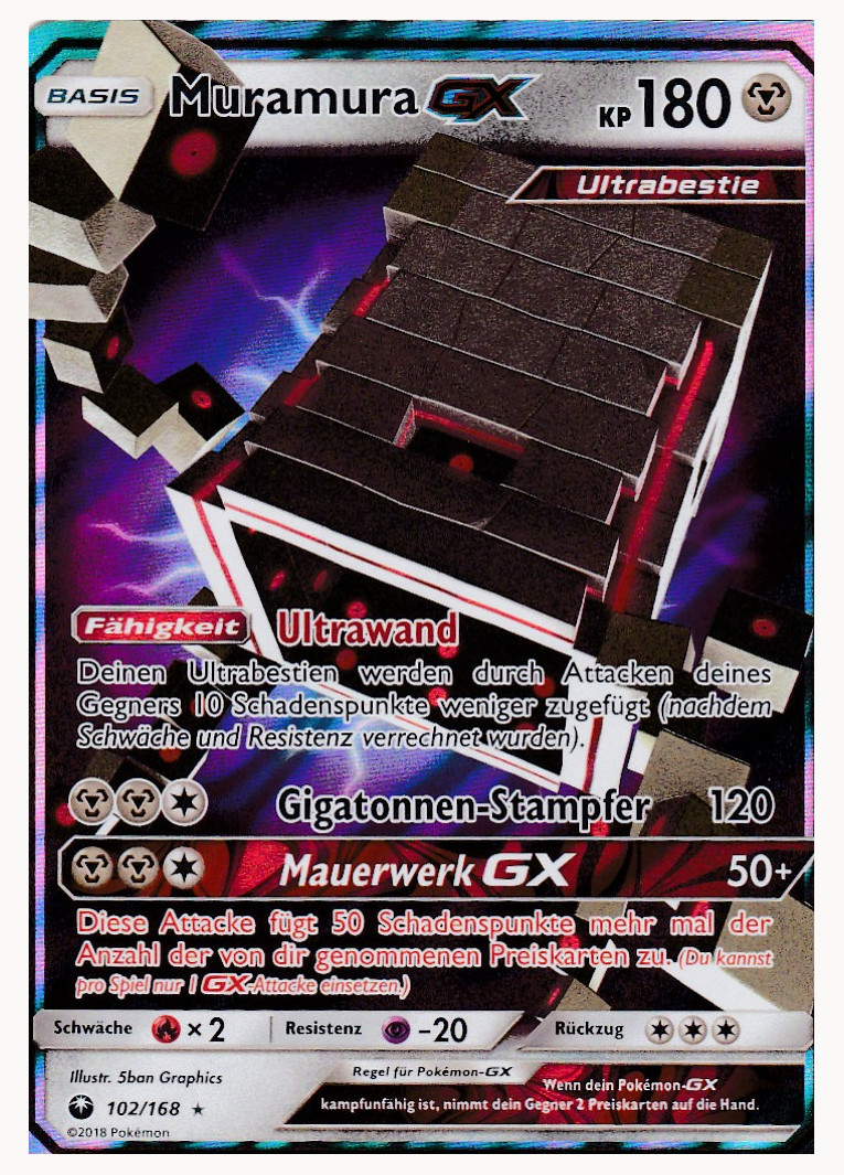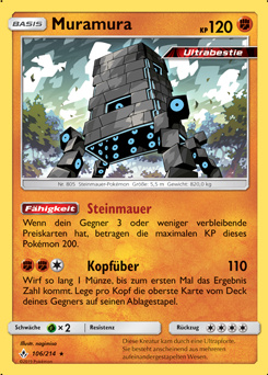Während Muramuras defensive Stärke etwas durch sein Typing, das ihm zwei häufige Vierfachschwächen aufbürdet, untergraben wird, eignet es sich dank seines unterirdischen Initiativewerts und hohen Angriffs als guter Bizarroraumangreifer. Eine der größten Stärken des Mauer-Pokémon ist dabei seine Fähigkeit, den Bizarroraum selbst heraufzubeschwören. Mit Gyroball und der durch Petrium Z noch weiter verstärkbaren Steinkante kann es dann auch direkt hart zuschlagen, wobei Erdbeben und Kraftkoloss Optionen für die Coverage v.a. gegen Stahlpokémon sind. Erdbeben trifft Durengard und erleichtert Muramura das Besiegen von Aggrostella, Kraftkoloss ist allerdings stärker gegen Tentantel und Katagami. Als Item kann auch der Leben-Orb gespielt werden, allerdings kann die Mauer dann bspw. Prioritätsangriffe nicht mehr so leicht wegstecken und man hat auch keinen einzelnen, sehr starken Angriff zur Verfügung, dafür etwas mehr Durchschlagskraft mit allen anderen Angriffen. Das Wesen und die DVs sind so gewählt, dass Muramura durch Bestien-Boost bei jedem KO einen Angriffsboost bekommt, was ihm als Bizarroraumangreifer weitaus mehr nützt als eine Steigerung der Verteidigung - der Angriffsboost ist es in der Regel sogar wert, die Verteidigung durch Wesen und DVs etwas zu schwächen. Wenn man den physischen Bulk aber keinesfalls reduzieren möchte, ist auch ein mutiges Wesen mit einem 31er-DV denkbar. Ein guter Partner ist Kapu-Toro, das Muramura typentechnisch hervorragend ergänzt und viele physisch defensive Switchins mit der passenden Attacke eliminieren kann. Demeteros-T deckt beide Vierfachschwächen der Ultrabestie ab und kann es mit Tarnsteinen unterstützen oder mit Schwerttanz ebenfalls potenzielle Muramura-Checks schwächen. Generell sind physische Angreifer wie Pinsir, die eine Bresche ins gegnerische Team schlagen können, um einen Sweep Muramuras zu ermöglichen, geeignete Kandidaten für weitere Teammitglieder.