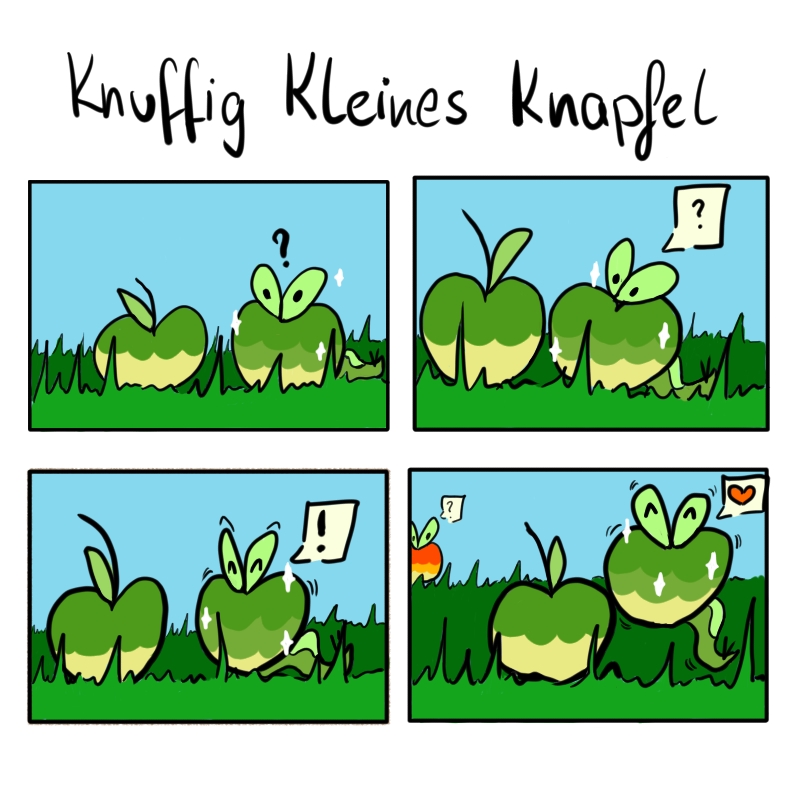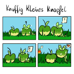 - NPS Nach der Geburt kriecht es sofort in einen Apfel und verspeist dessen Inneres, um zu wachsen. Wenn es von einem hohen Ort herunterfällt, purzelt es manchmal aus seinem Apfel.